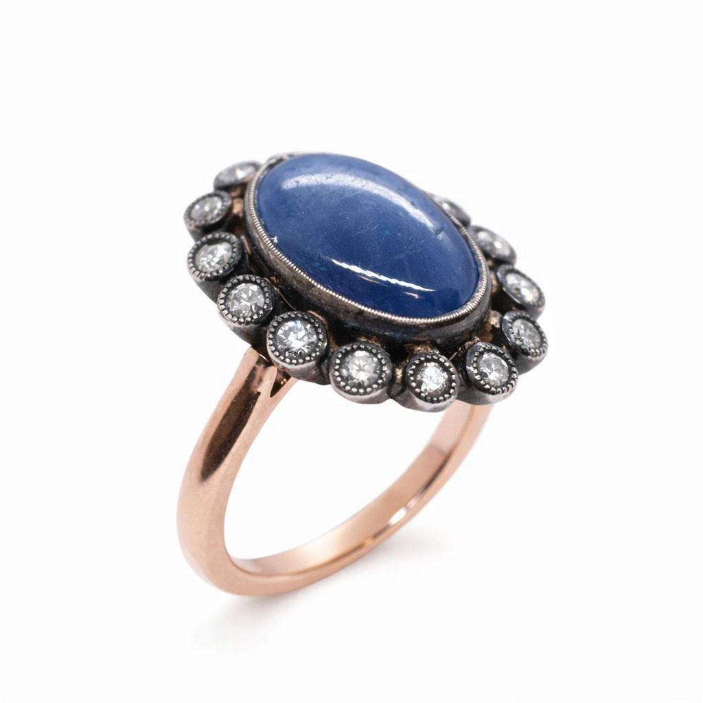 Ten niezwykle charakterystyczny pierścionek z szafirem i diamentami to propozycja dla osób ceniących biżuterię o unikalnym stylu i wyrafinowanym wyglądzie. Wykonany z połączenia różowego złota próby 585 oraz srebra 925, wyróżnia się kontrastową kolorystyką oraz eleganckim, klasycznym designem inspirowanym stylem vintage.