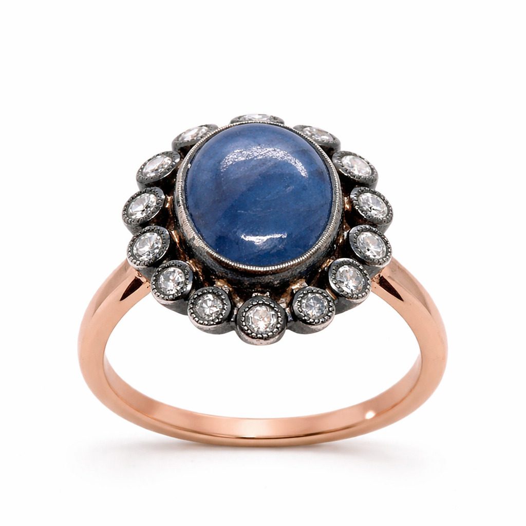 Centralnym elementem pierścionka jest naturalny szafir o masie 4,53 ct, który zachwyca głębokim, niebieskim odcieniem oraz subtelnym, aksamitnym połyskiem. Kamień w formie kaboszonu został osadzony w ozdobnej oprawie, która podkreśla jego naturalne piękno i nadaje mu wyjątkowego charakteru.