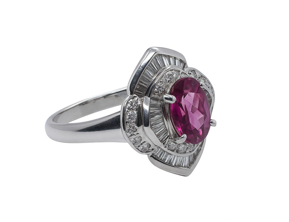 Ten luksusowy pierścionek to esencja elegancji i prestiżu. Wykonany z najwyższej próby platyny 950, zachwyca centralnie osadzonym rubinem o masie 1,14 ct w intensywnie różowo-czerwonym odcieniu. Kamień otoczony jest misterną kompozycją diamentów o łącznej masie 0,40 ct w szlifach okrągłym i bagietkowym, które nadają pierścionkowi wyjątkowego blasku i głębi.