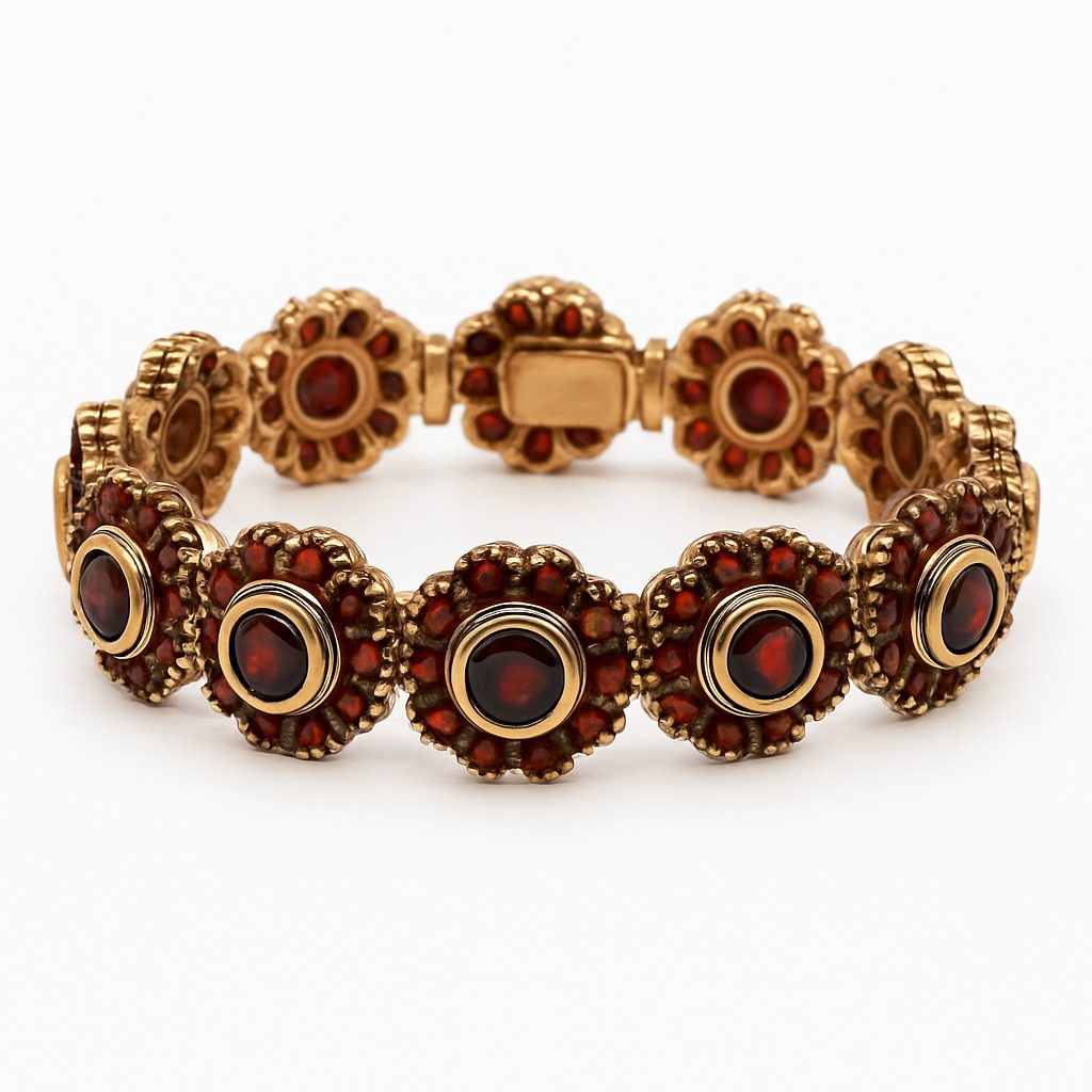 Zjawiskowa złota bransoleta z żółtego złota próby 585, ozdobiona głębokoczerwonymi granatami. Elegancki i unikatowy wyrób jubilerski z certyfikatem.