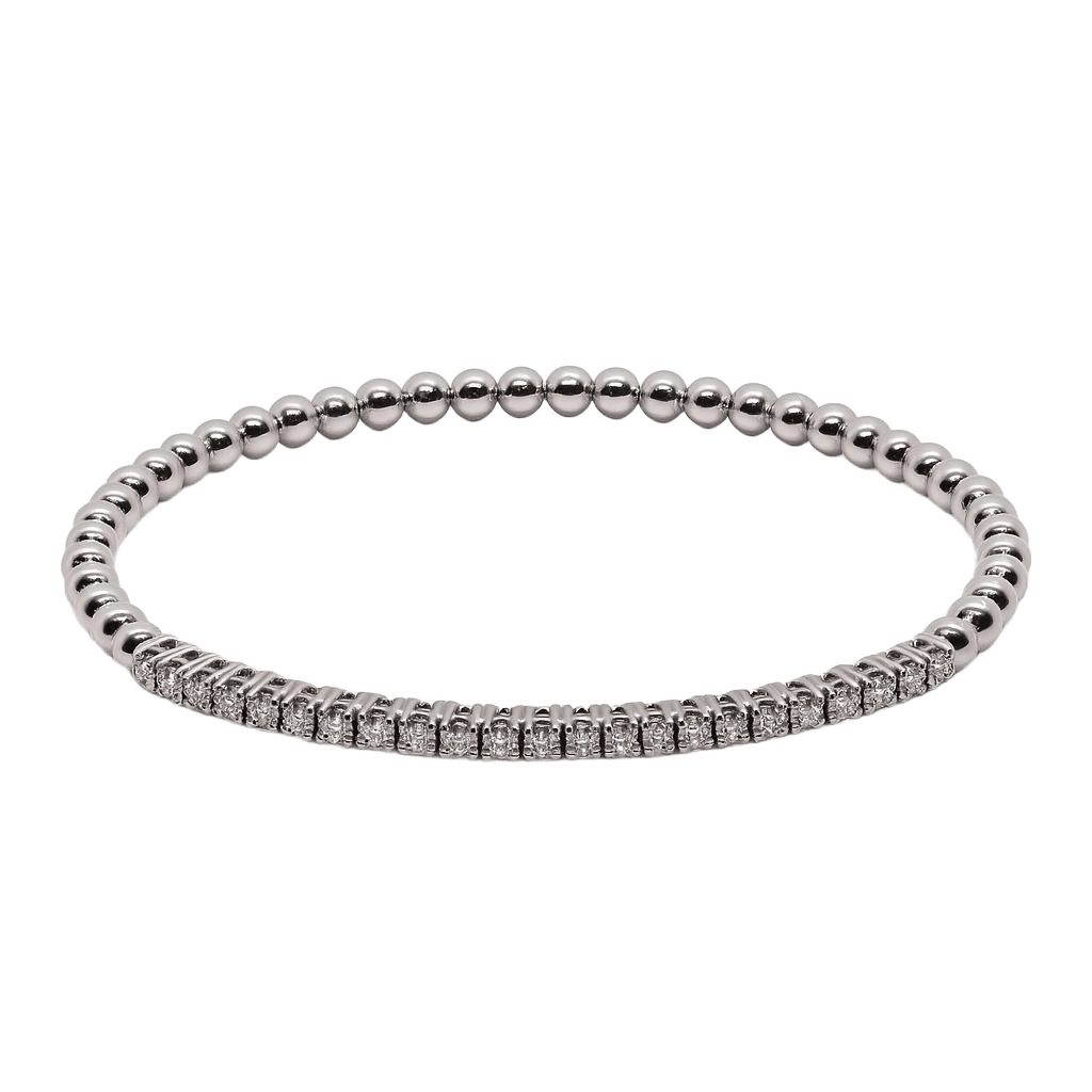 Ekskluzywna bransoletka z białego złota próby 750, zdobiona diamentami o łącznej masie 0.95 ct. Elastyczna długość ok. 17,5–20 cm. Nowy wyrób z certyfikatem.