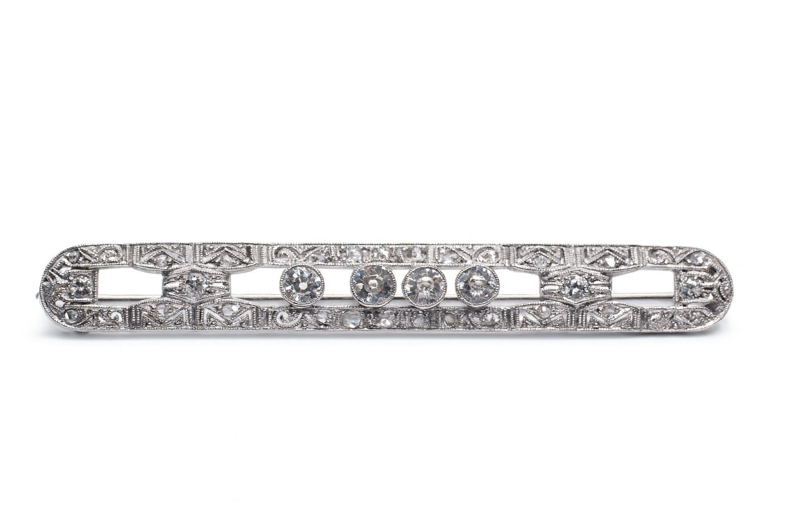 Stylowa brosza z białego złota próby 585, ozdobiona diamentami o łącznej masie 0.45 ct. Waga 5,91 g – elegancki dodatek w stylu vintage.