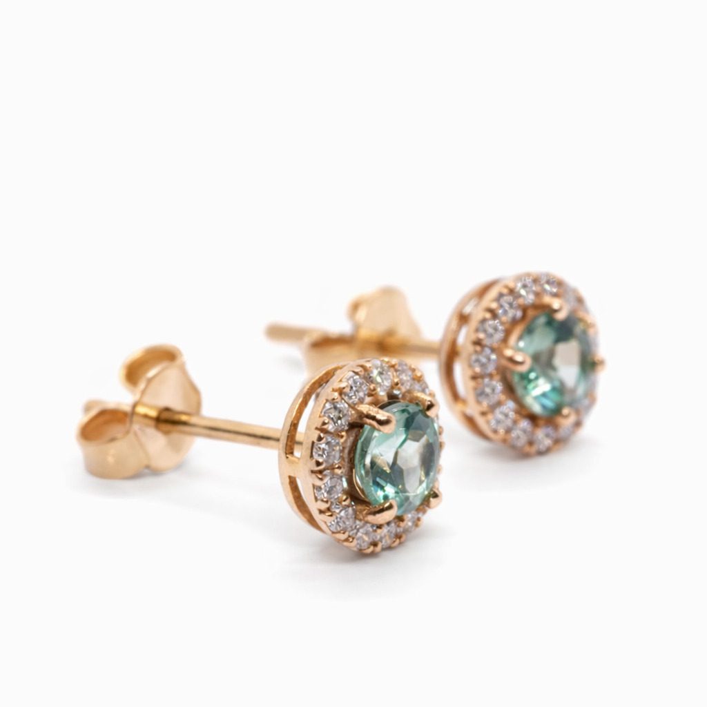 Eleganckie złote kolczyki z aleksandrytami i diamentami o wyjątkowym blasku. Wykonane z żółtego złota próby 750, zachwycają subtelnym stylem i luksusowym wykończeniem.