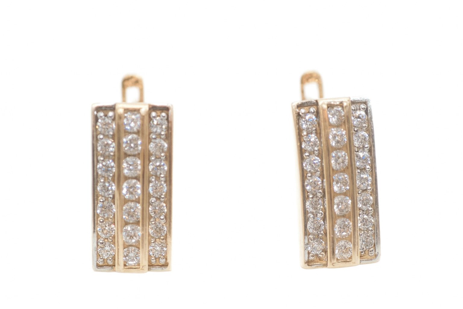 Złote kolczyki próby 585 z cyrkoniami, waga 4,30 g, zapięcie angielskie, kolor złota żółty.