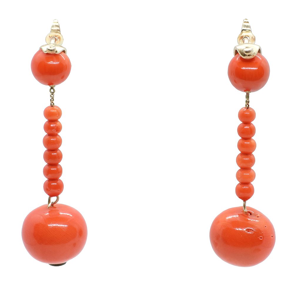 Złote kolczyki z naturalnymi koralami, próba 585, zapięcie sztyft, długość 48 mm. Wyrób używany.