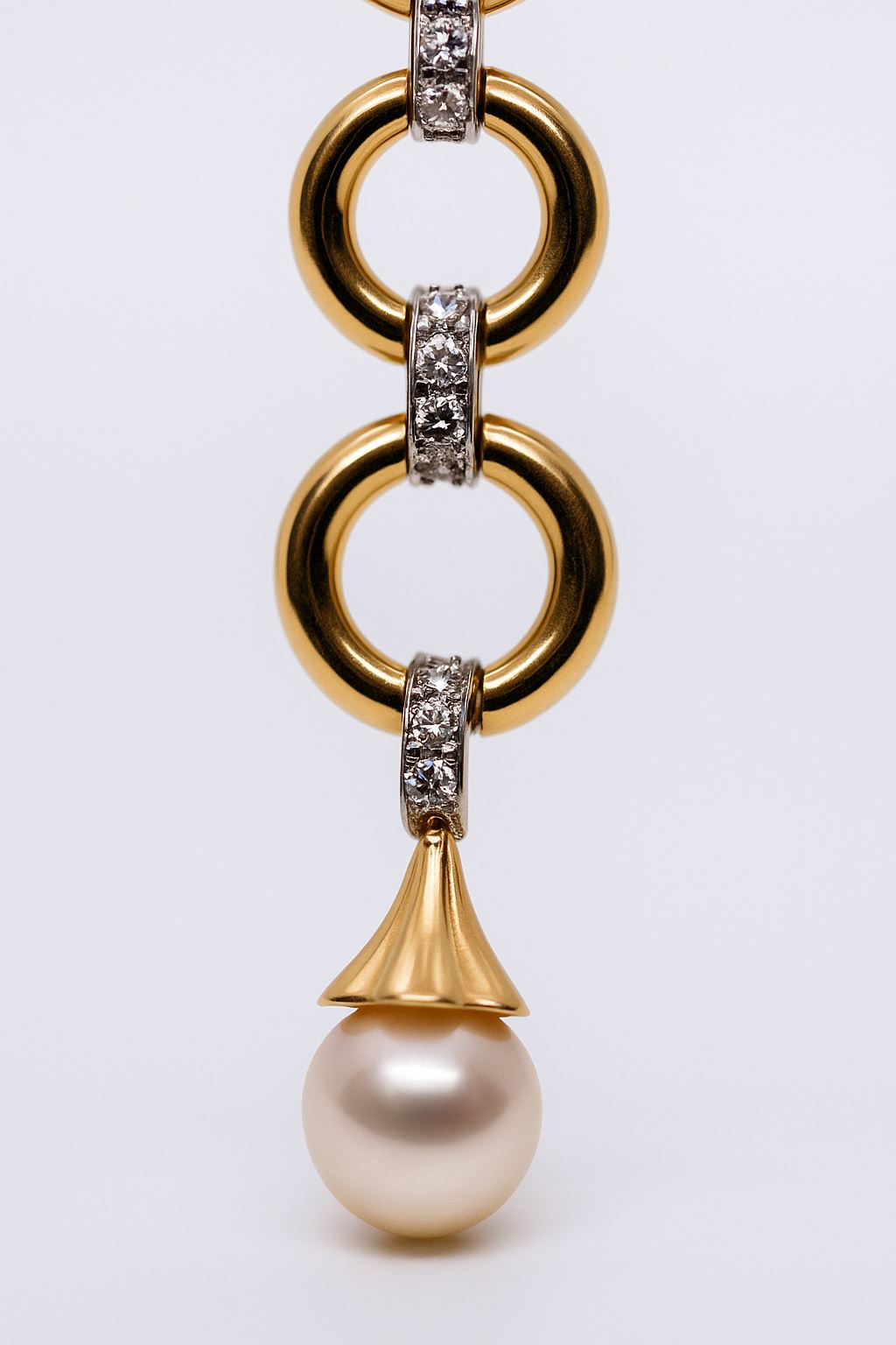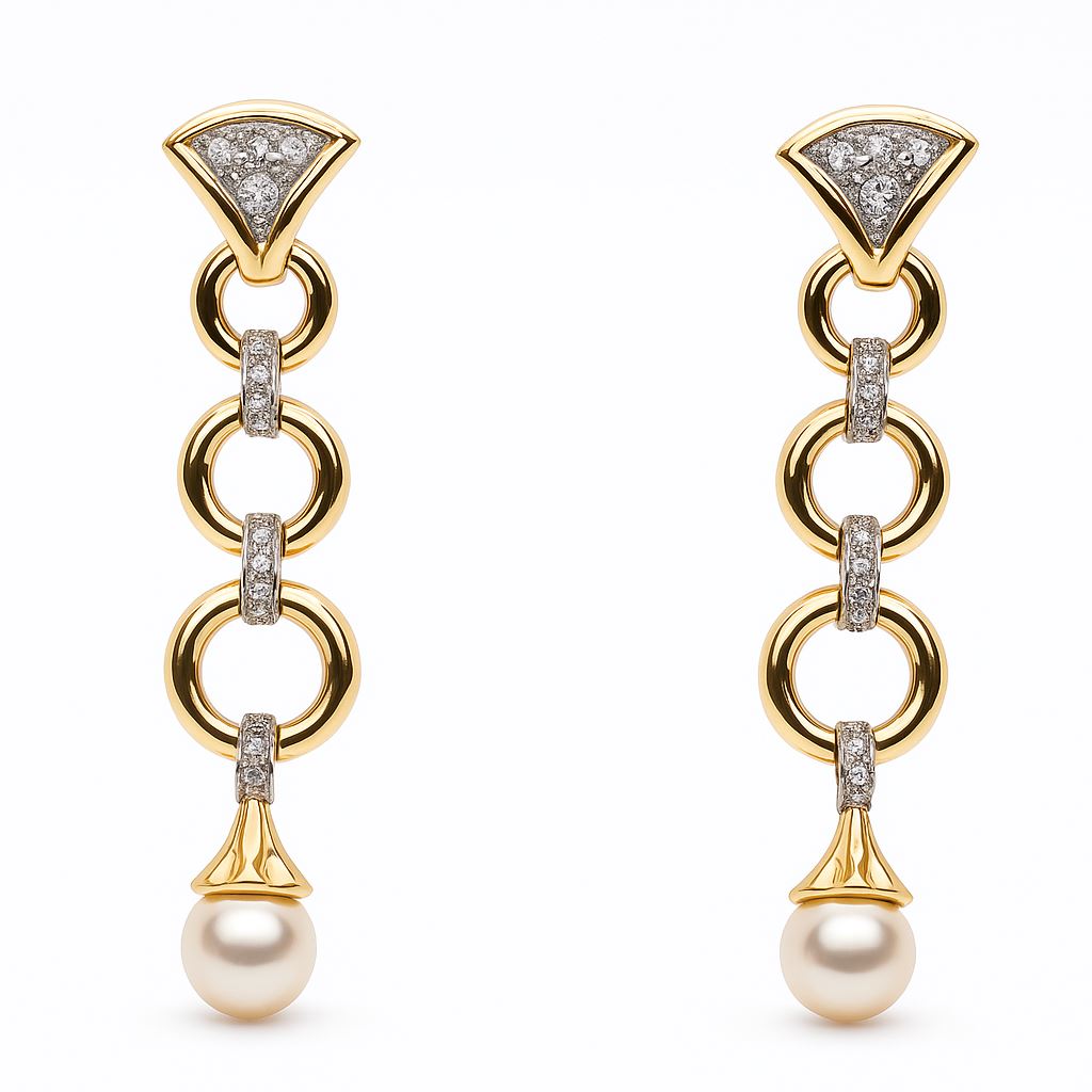 Te efektowne, długie kolczyki zostały wykonane z wysokiej jakości żółtego złota próby 750. Ich ażurowa konstrukcja z ozdobnymi łącznikami wysadzanymi diamentami (o łącznej masie 0.23 ct) prowadzi do subtelnych, idealnie okrągłych pereł o średnicy 8 mm. To wyrafinowane połączenie sprawia, że kolczyki przyciągają wzrok i doskonale komponują się z eleganckimi stylizacjami wieczorowymi. Biżuteria używana, w bardzo dobrym stanie, sprzedawana z certyfikatem autentyczności.