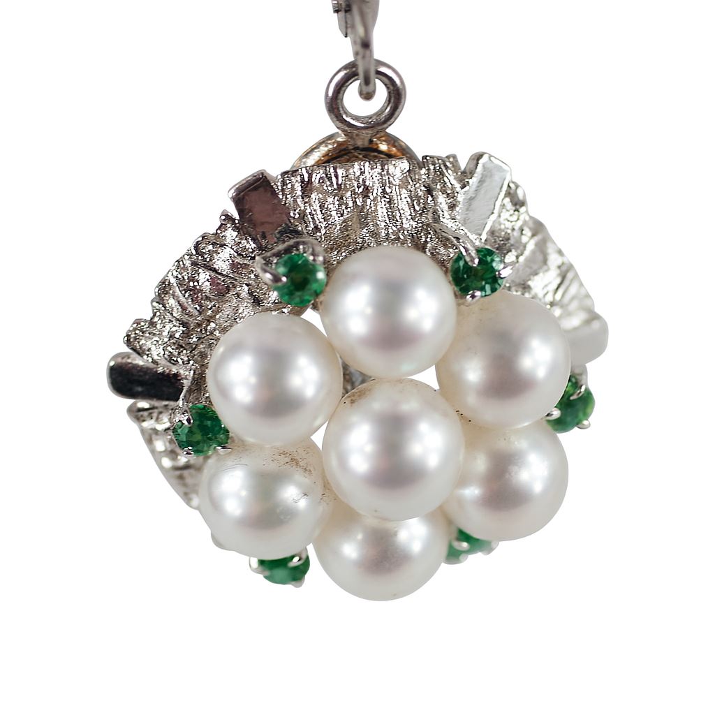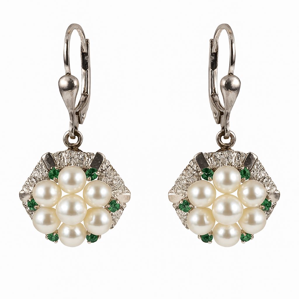 Eleganckie złote kolczyki z perłami i szmaragdami, wykonane z białego złota próby 585. Wyrób używany z certyfikatem.