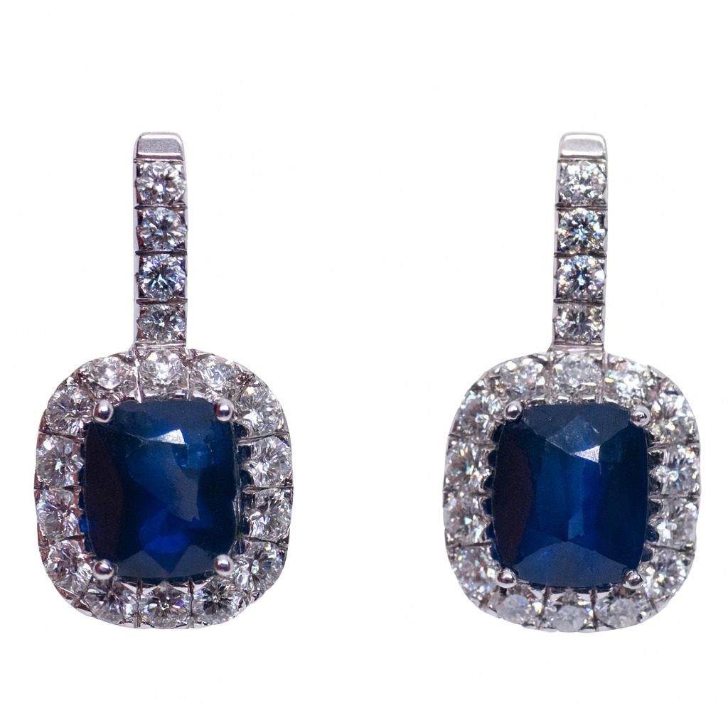 Ekskluzywne kolczyki z białego złota próby 750 z szafirami (4,40 ct) i diamentami (1,68 ct). Luksusowa forma z angielskim zapięciem.