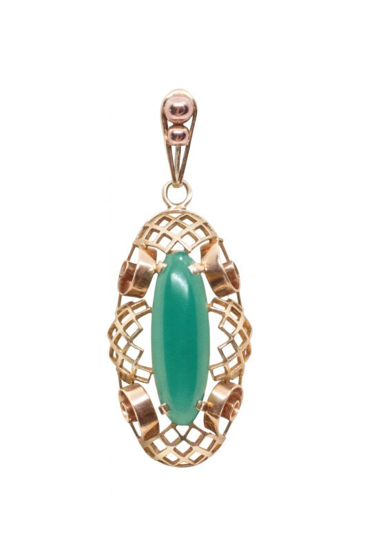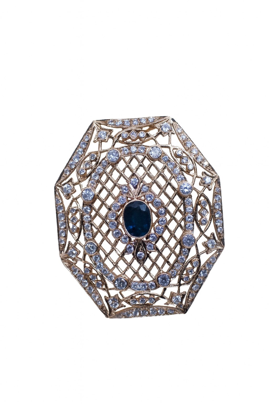 Ażurowa konstrukcja o ośmiokątnym kształcie, z misternie rozmieszczonymi kamieniami, przywodzi na myśl biżuterię z epoki art déco. Dzięki zamocowaniu umożliwiającemu noszenie zarówno jako broszka, jak i wisiorek, ten unikatowy egzemplarz stanowi wyrafinowany dodatek na wyjątkowe okazje.