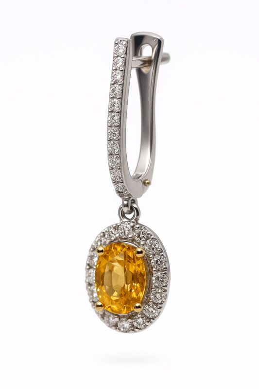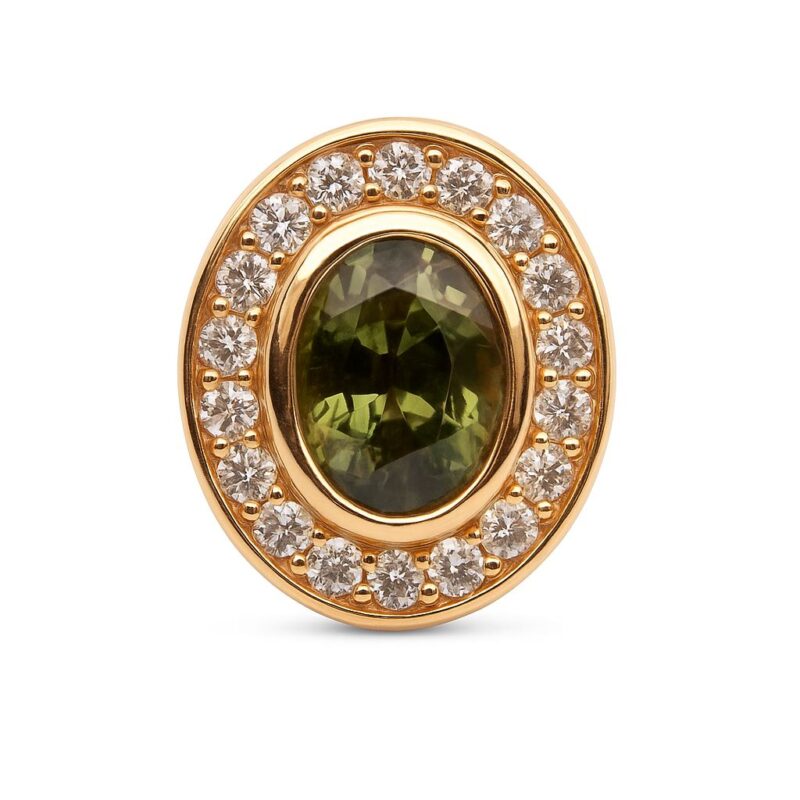 Zachwycający, bogato zdobiony broszko-wisior wykonany z żółto-białego złota próby 585 to połączenie klasyki i biżuteryjnego kunsztu. Jego serce stanowi owalny, głęboko granatowy szafir o masie 1,10 ct, otoczony licznymi diamentami o łącznej masie 1,70 ct.