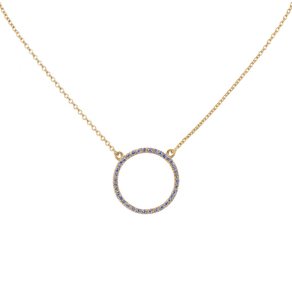 Ten elegancki naszyjnik został wykonany z 14-karatowego żółtego złota (próba 585), które doskonale podkreśla blask szlachetnych kamieni. Centralnym elementem biżuterii jest delikatne koło wysadzane diamentami o łącznej masie 0.22 ct, symbolizujące harmonię, nieskończoność i pełnię życia.