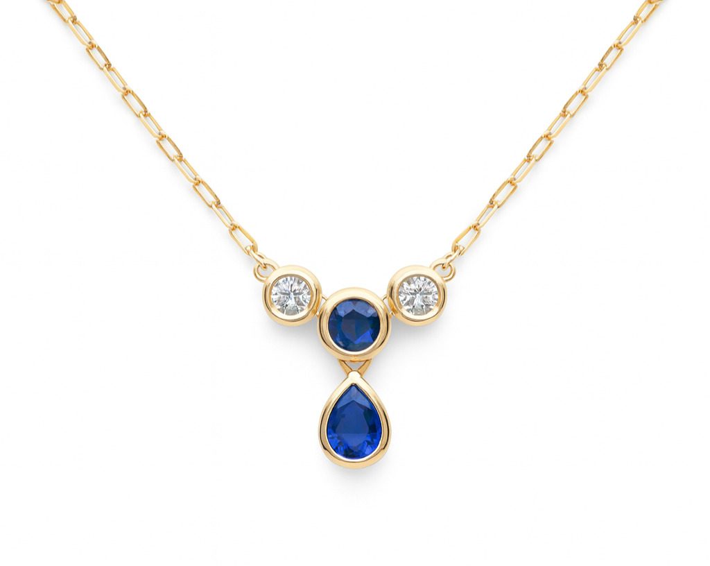 Ten wyjątkowy naszyjnik zachwyca subtelną elegancją i ponadczasowym stylem. Wykonany z żółtego złota próby 585/750, zdobiony jest dwoma lśniącymi diamentami o łącznej masie 0,11 ct oraz trzema głębokimi, niebieskimi szafirami o masie 0,68 ct. Centralny element tworzy harmonijną kompozycję okrągłych i łezkowatych opraw, które pięknie eksponują kamienie. Długość 55 cm pozwala na wygodne noszenie, a ponadczasowy design sprawia, że naszyjnik doskonale pasuje zarówno do codziennych, jak i wieczorowych stylizacji. Idealny wybór dla miłośniczek klasycznej, a zarazem wyrafinowanej biżuterii.