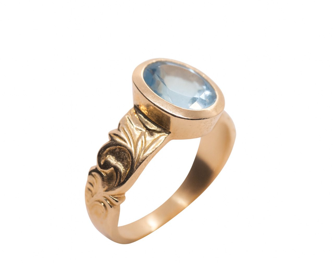 Ten wyjątkowy pierścionek wykonany z żółtego złota próby 750 zachwyca klasycznym pięknem i kunsztem jubilerskim. Centralne miejsce zajmuje akwamaryn o masie 2,50 ct — kamień o delikatnej, błękitnej barwie symbolizującej spokój, harmonię i czystość.