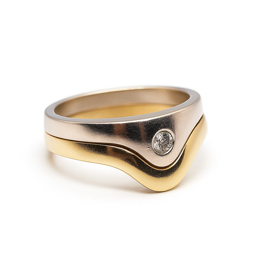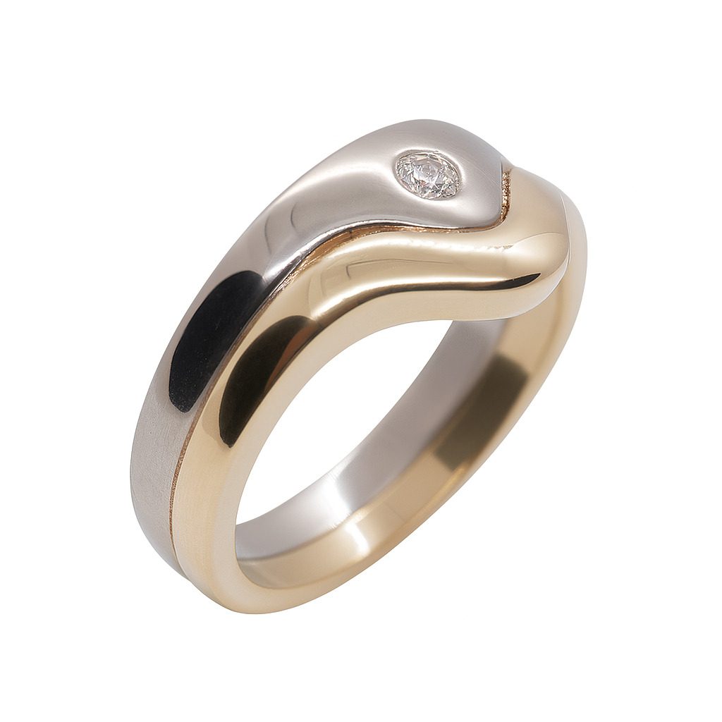 Nowoczesny pierścionek z żółto-białego złota próby 585 z subtelnym brylantem 0,04 ct. Designerska forma i solidne wykonanie dla kobiet ceniących oryginalność.