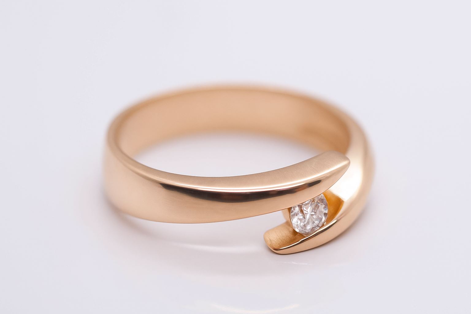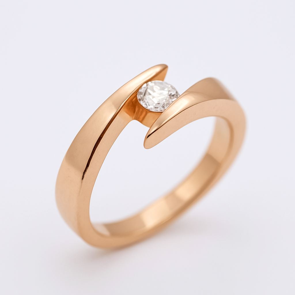 Złoty pierścionek próby 585 z brylantem o masie 0.25 ct, w nowoczesnej, eleganckiej oprawie. Używany wyrób z certyfikatem, rozmiar 16.