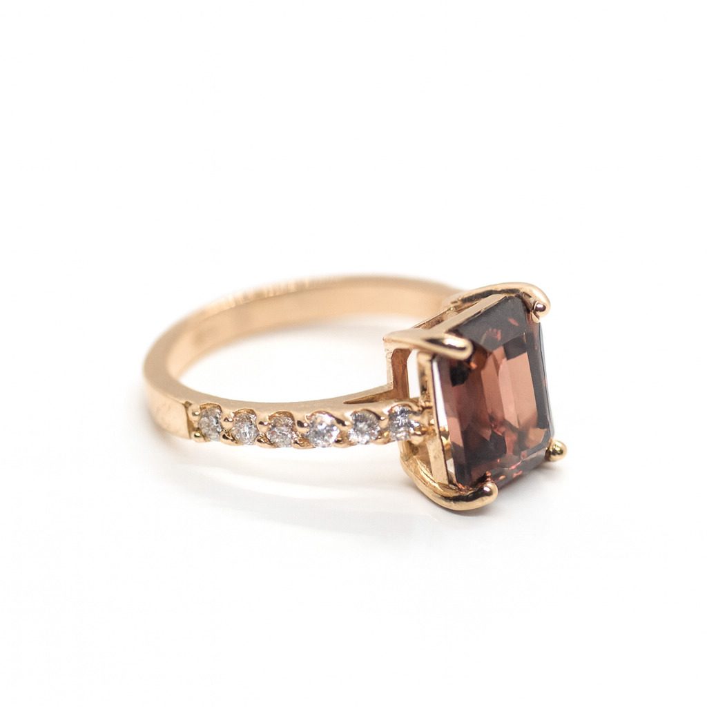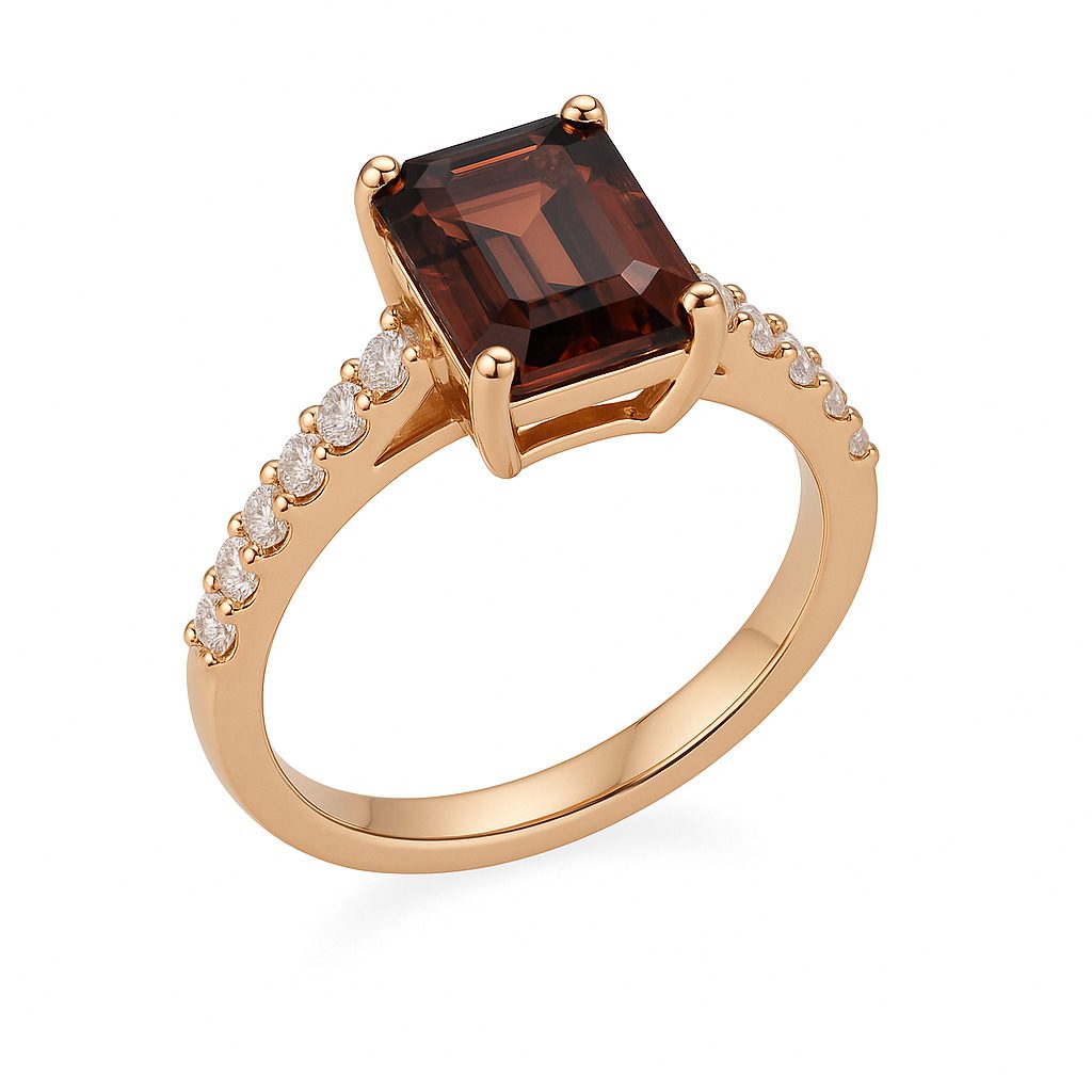 Ten wyjątkowy pierścionek wykonany z żółtego złota próby 585 to połączenie klasycznej formy z wyrazistym blaskiem. Centralny punkt stanowi duży, prostokątnie szlifowany cyrkon o masie 5.05 ct, który przyciąga wzrok głęboką barwą i doskonałą przejrzystością.