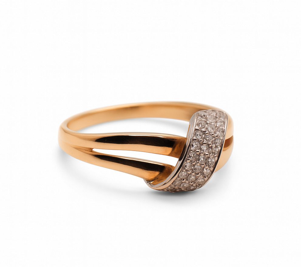 Delikatny i elegancki pierścionek z żółtego złota najwyższej próby 750, ozdobiony drobnymi, lśniącymi cyrkoniami osadzonymi w dekoracyjnym, lekko wypukłym elemencie. Jego forma przypomina splecione pasma, co nadaje mu nowoczesnego i zarazem klasycznego charakteru. Wyrób używany, zachowany w bardzo dobrym stanie. Waga pierścionka to 1,98 g, rozmiar 12 – idealny dla osób szukających subtelnej, ale efektownej biżuterii na co dzień lub na prezent.