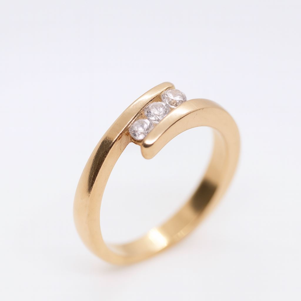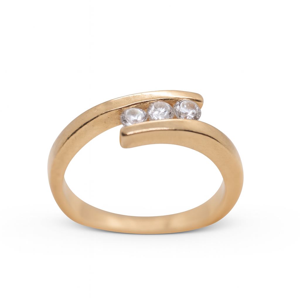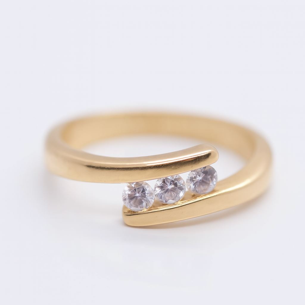 Złoty pierścionek z żółtego złota próby 750, ozdobiony trzema cyrkoniami w eleganckim, otwartym kształcie. Rozmiar 12. Wyrób używany.