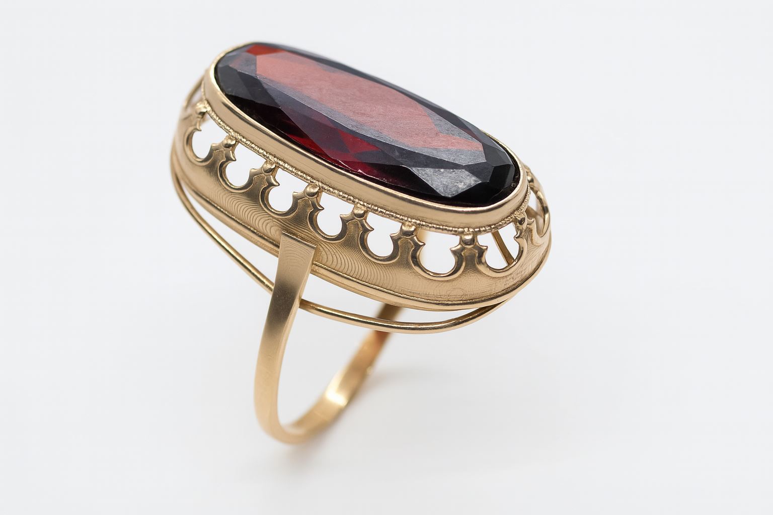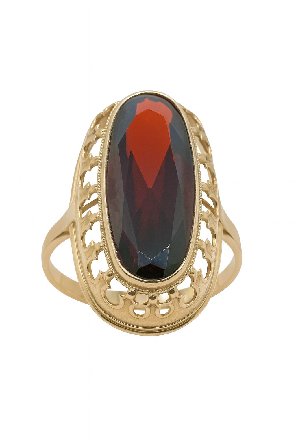 Zachwycający złoty pierścionek o wyjątkowym, stylizowanym designie, który przyciąga wzrok elegancką, ażurową oprawą i głęboką barwą czerwonej cyrkonii. Wykonany z żółtego złota próby 585, pierścionek waży 9,68 g i ma rozmiar 21 – idealny dla kobiet ceniących wyrazistą biżuterię z nutą klasycznej elegancji. Owalna, fasetowana cyrkonia w intensywnym odcieniu bordo subtelnie kontrastuje ze złotem, tworząc biżuterię idealną zarówno na specjalne okazje, jak i do codziennego noszenia. Wyrób używany, w bardzo dobrym stanie.