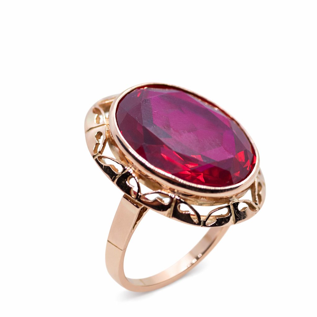 Ten efektowny pierścionek wykonany z żółtego złota próby 585 przyciąga uwagę imponującym czerwonym kamieniem o głębokiej, intensywnej barwie. Owalny szlif kamienia podkreśla jego głębię i pięknie odbija światło, nadając biżuterii szlachetnego charakteru.