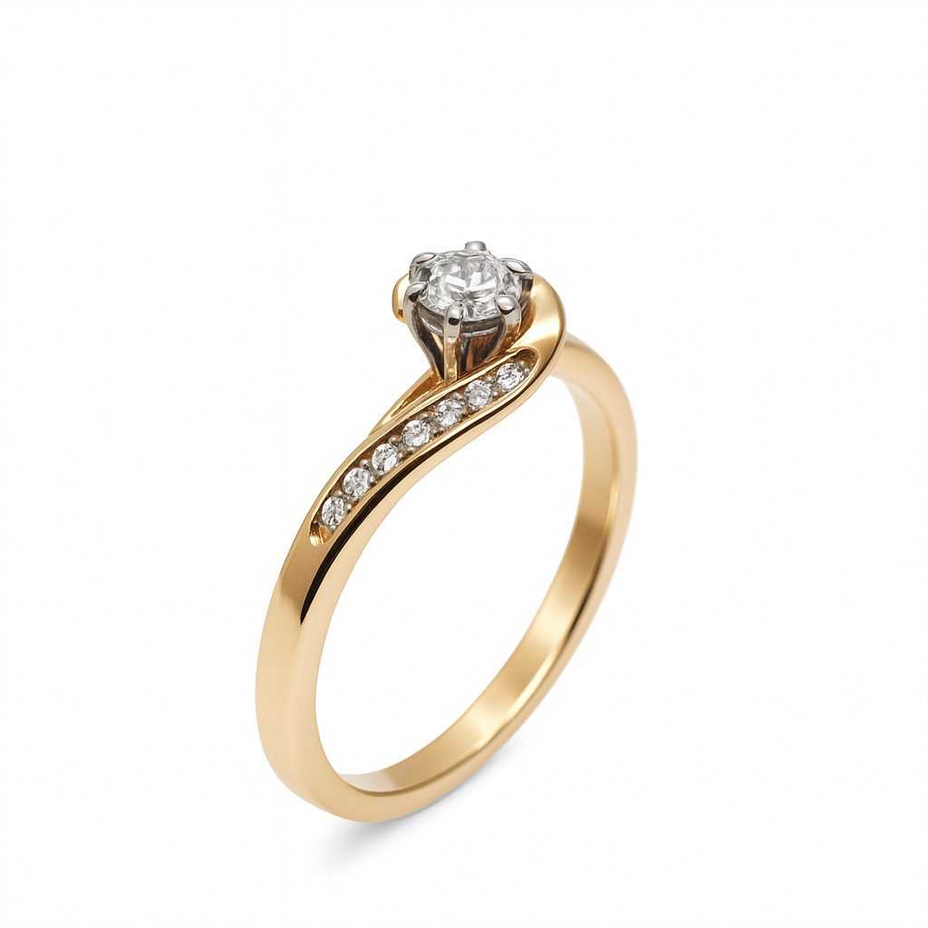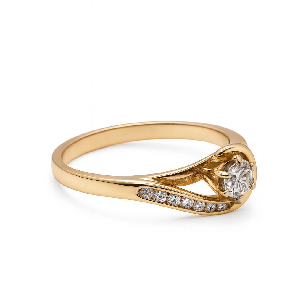 Ten elegancki pierścionek wykonany z wysokiej jakości żółtego złota próby 750 to kwintesencja nowoczesnego stylu i ponadczasowej klasy. Delikatne linie obrączki płynnie oplatają centralnie osadzony diament, tworząc subtelny i niezwykle kobiecy design. Dodatkowe diamenty osadzone wzdłuż ramienia pierścionka dodają blasku i lekkości. Całkowita masa kamieni to 0,20 ct, a całość waży 2,84 g. Rozmiar 16 sprawia, że idealnie dopasowuje się do dłoni. To idealny wybór na zaręczyny lub jako prezent, który wyrazi uczucia bez słów.