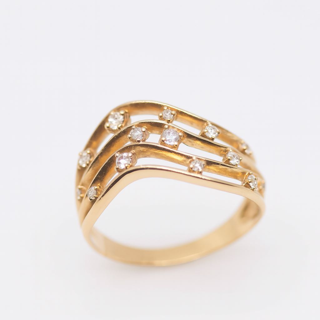 Złoty pierścionek próby 585 z brylantami o łącznej masie 0,20 ct. Ażurowy wzór z 14 diamentami. Rozmiar 18. Wyrób używany.