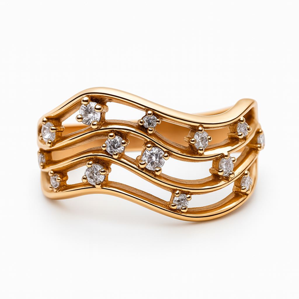 Elegancki i efektowny złoty pierścionek o ażurowym wzorze, wykonany z żółtego złota próby 585. Jego wyjątkowy design tworzą finezyjne linie, ozdobione aż 14 brylantami o łącznej masie 0,20 ct, które subtelnie lśnią przy każdym ruchu dłoni. Waga pierścionka to 3,20 g, a rozmiar 18 – idealny dla kobiet poszukujących niebanalnej biżuterii z nutą luksusu. Wyrób używany, oferowany z certyfikatem autentyczności.