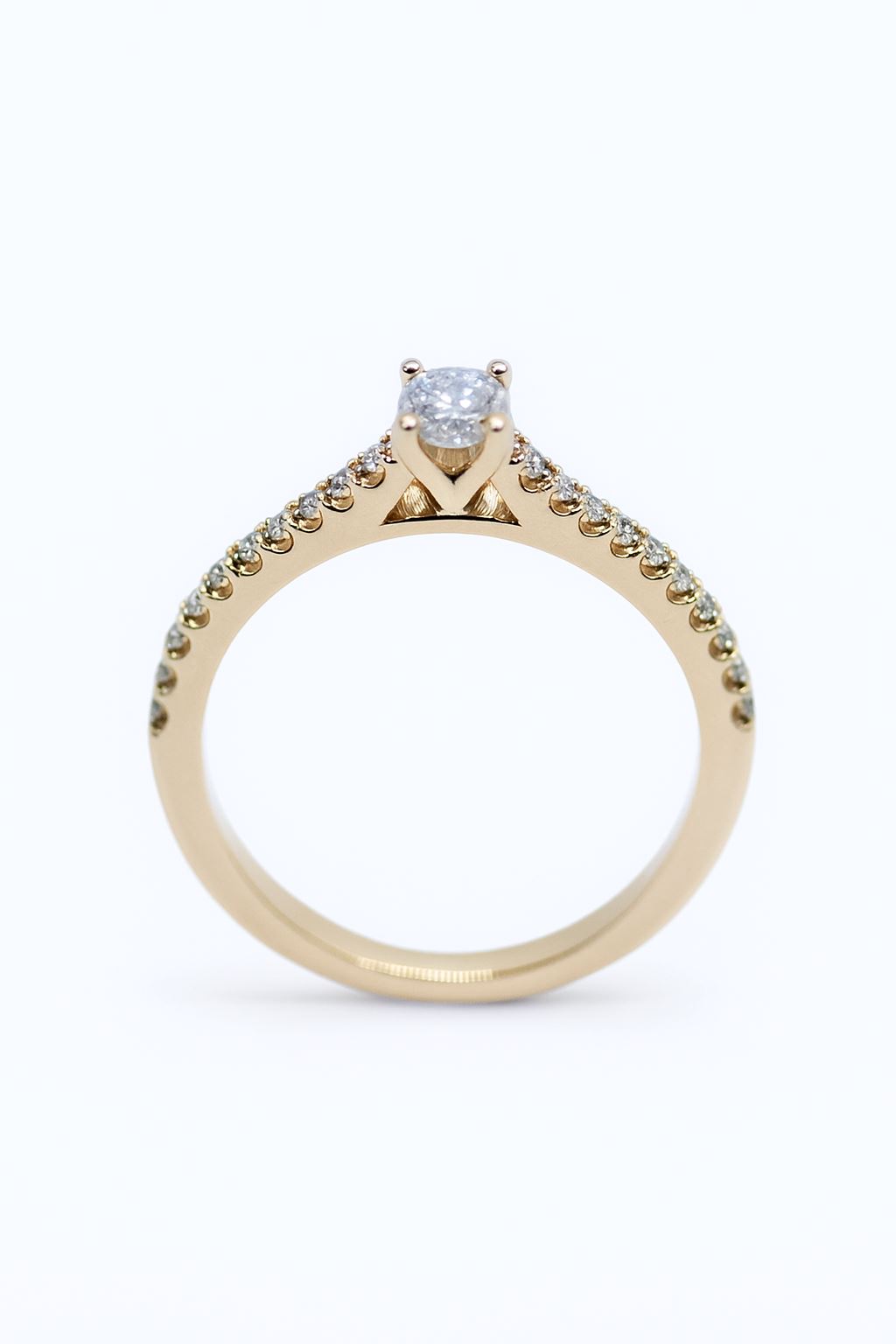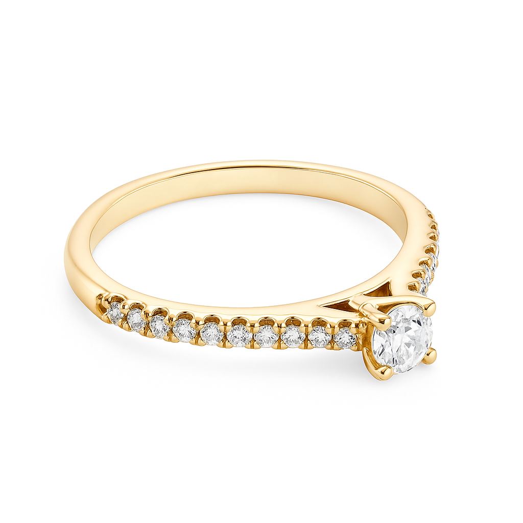 Ten klasyczny pierścionek został wykonany z żółtego złota próby 585 i ozdobiony diamentami o łącznej masie 0.35 ct, z czego centralny kamień ma 0.18 ct, wyróżniając się wyjątkowym blaskiem i ponadczasowym stylem. Diamentowa oprawa biegnąca wzdłuż obrączki pięknie uzupełnia całość, nadając pierścionkowi luksusowego charakteru i subtelnej elegancji. Idealny wybór na zaręczyny, wyjątkowy prezent lub jako ozdoba na co dzień. Nowy wyrób jubilerski, sprzedawany z certyfikatem autentyczności. Rozmiar 14.