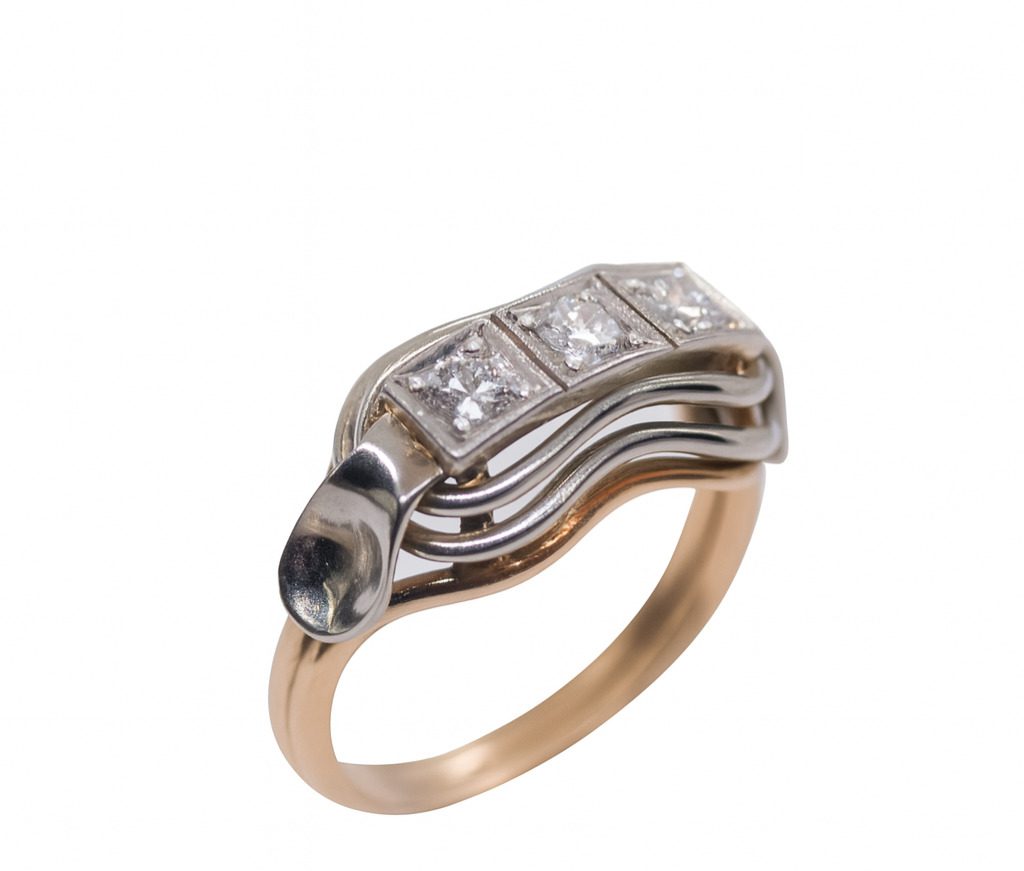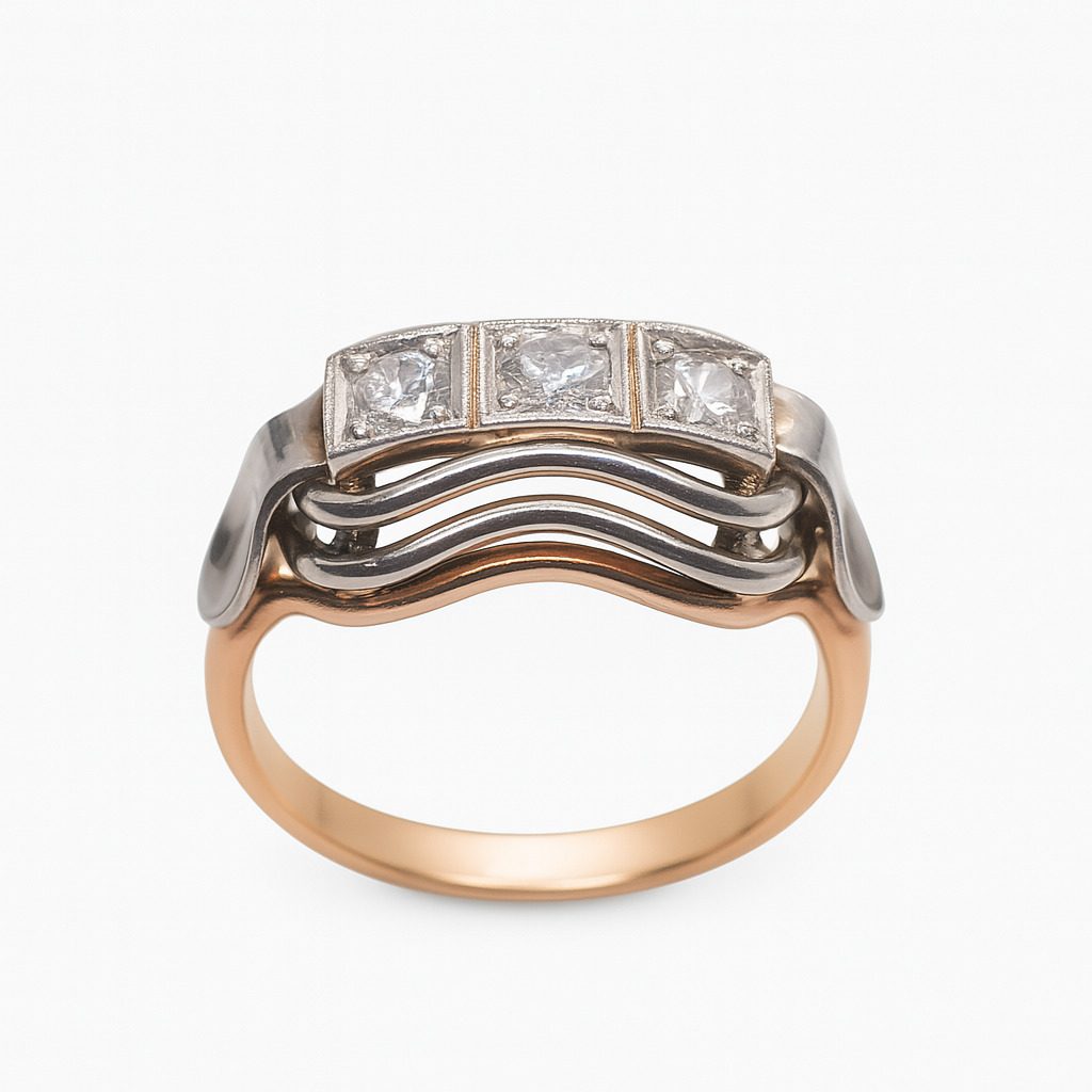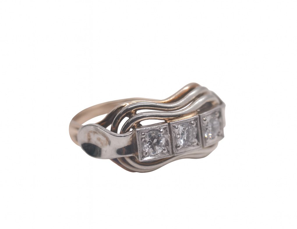 Złoty pierścionek z żółto-białego złota próby 585 z trzema diamentami o masie łącznej 0,36 ct – nowoczesna forma i klasyczny blask.