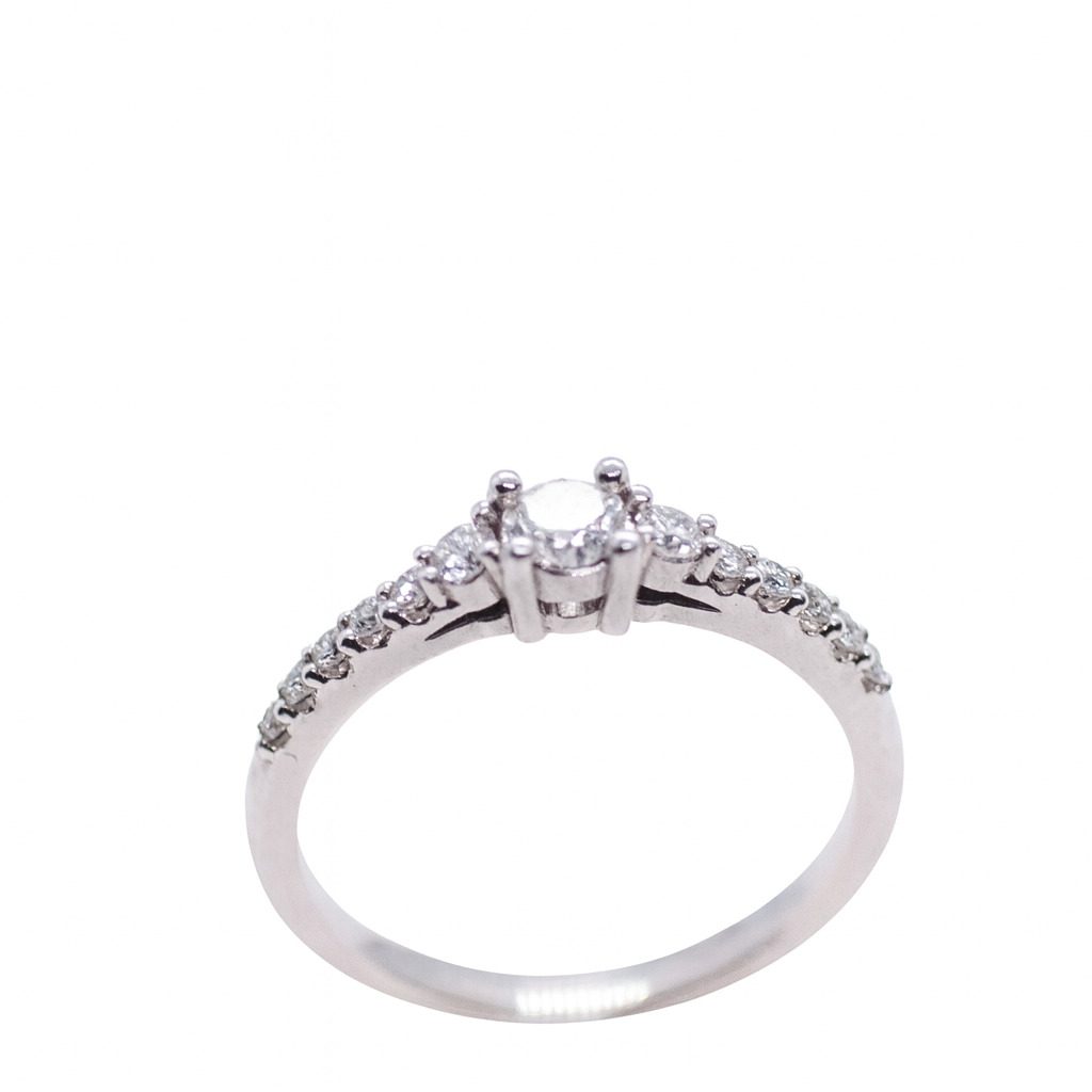 Złoty pierścionek z białego złota próby 585, ozdobiony diamentami o łącznej masie 0,38 ct. Klasyczna elegancja i subtelny blask – idealny na zaręczyny lub wyjątkowy prezent.