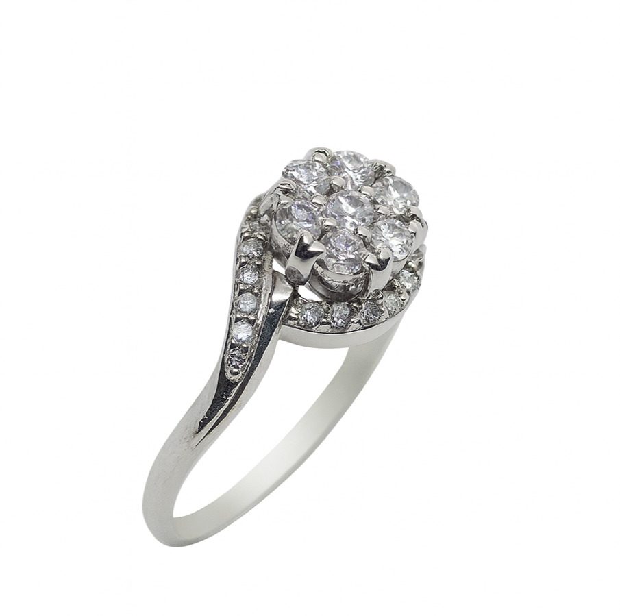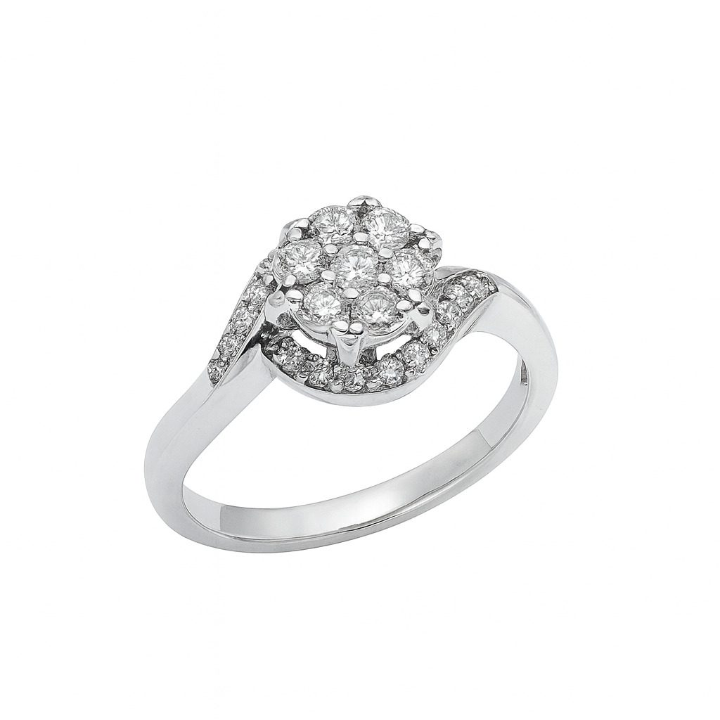 Ten wyjątkowy pierścionek wykonany został z najwyższej jakości białego złota próby 750, które podkreśla luksusowy charakter biżuterii. Centralny motyw kwiatowy, stworzony z lśniących diamentów o łącznej masie 0.44 ct, przyciąga wzrok i emanuje subtelnym blaskiem. Dodatkowo finezyjnie zakrzywiona oprawa z bocznymi diamentami podkreśla elegancję całości i dodaje nowoczesnego sznytu.