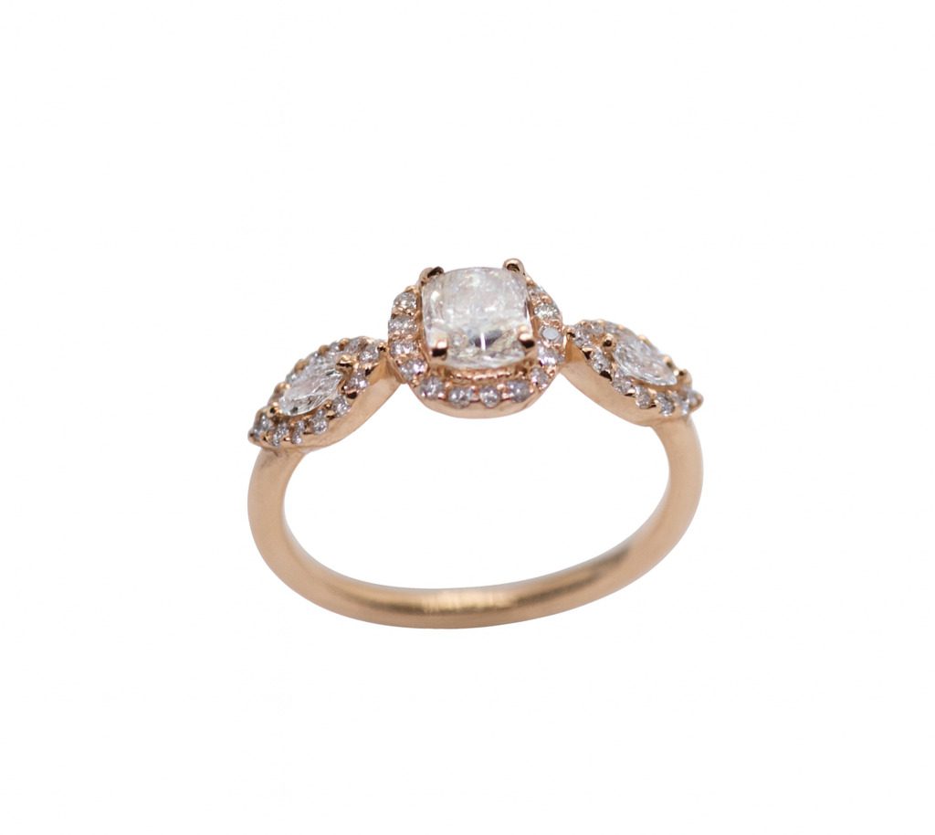 Elegancki pierścionek wykonany z żółtego złota próby 585, ozdobiony trzema centralnie osadzonymi diamentami, z których każdy otoczony jest delikatnym halo z drobnych brylantów. Całkowita masa diamentów wynosi 1,11 ct, co nadaje pierścionkowi wyjątkowego blasku i luksusowego charakteru.