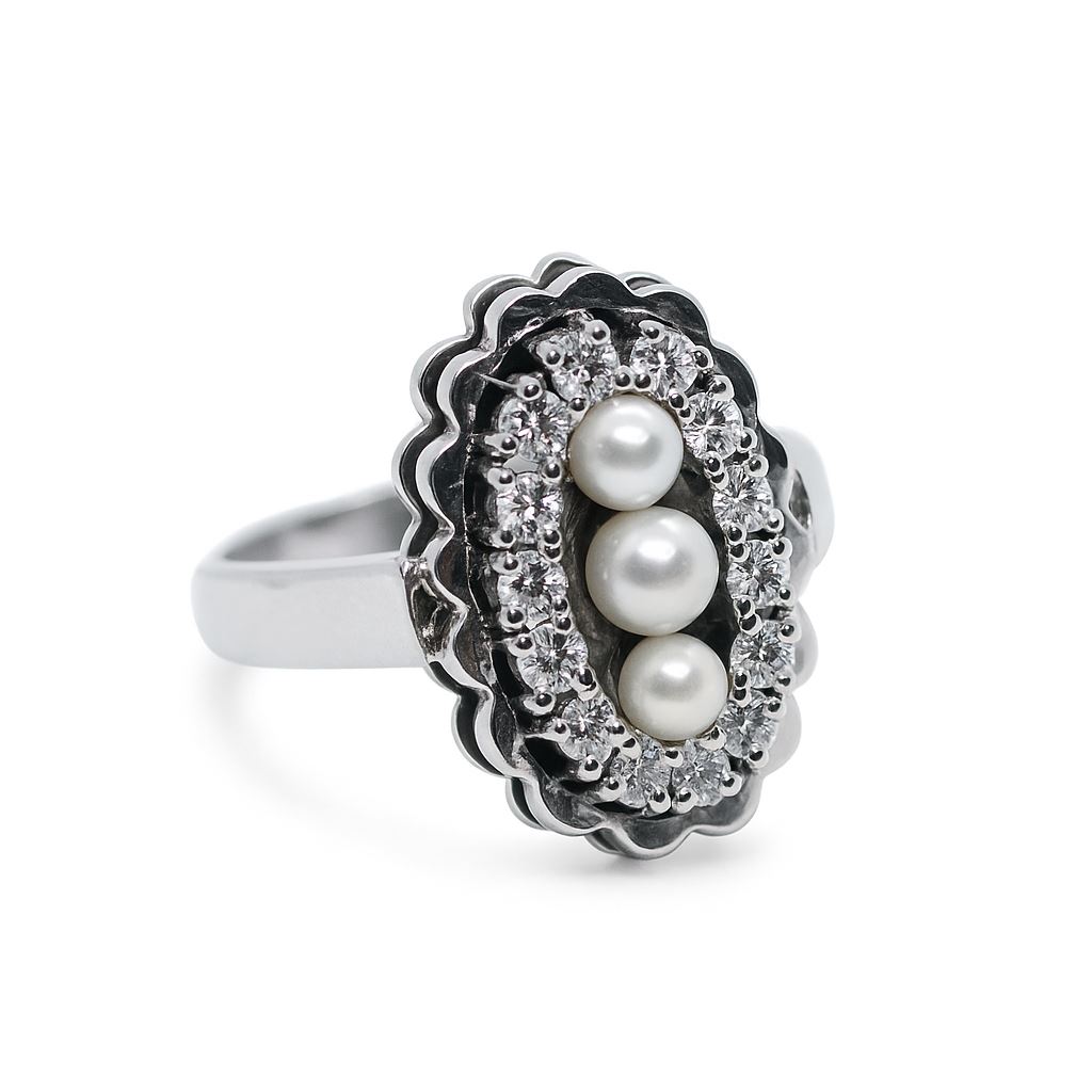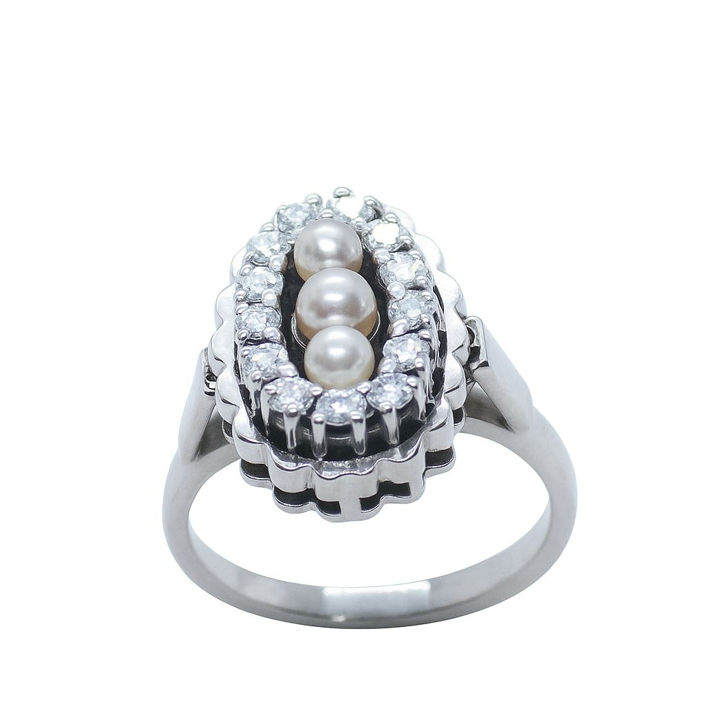 Wyjątkowy pierścionek z białego złota próby 585, ozdobiony diamentami (0.50 ct) oraz hodowlanymi perłami o średnicy 3,3–4,2 mm. Używany wyrób z certyfikatem, rozmiar 16.
