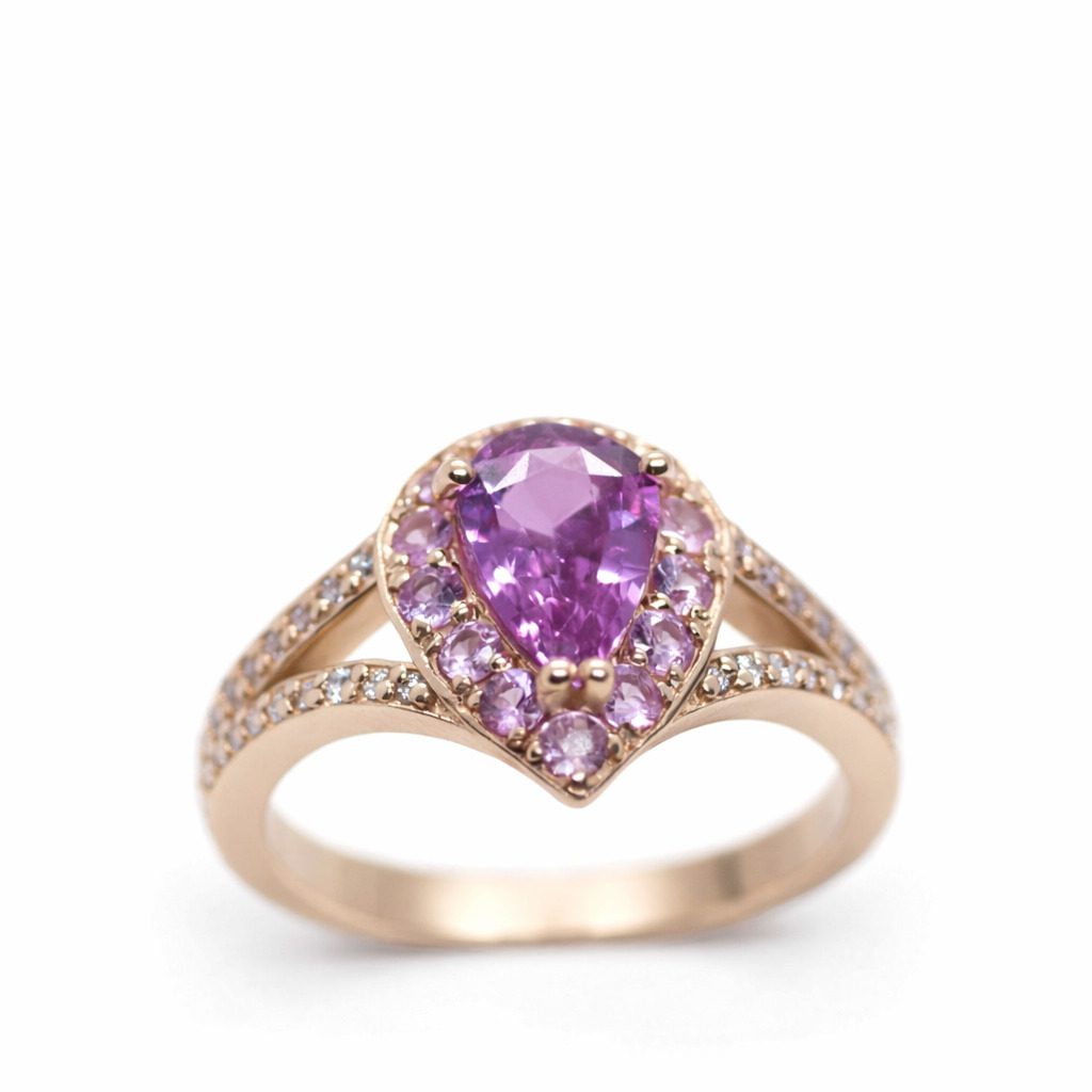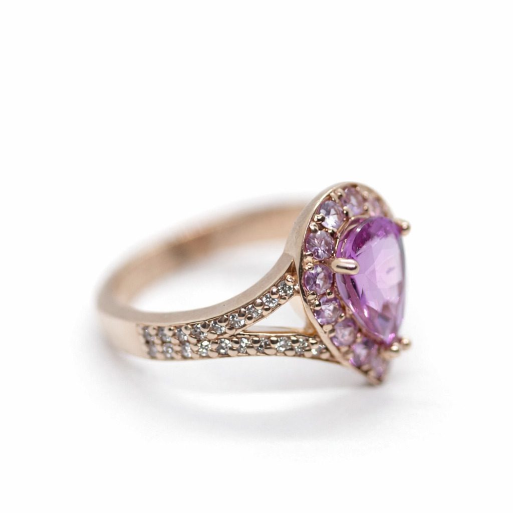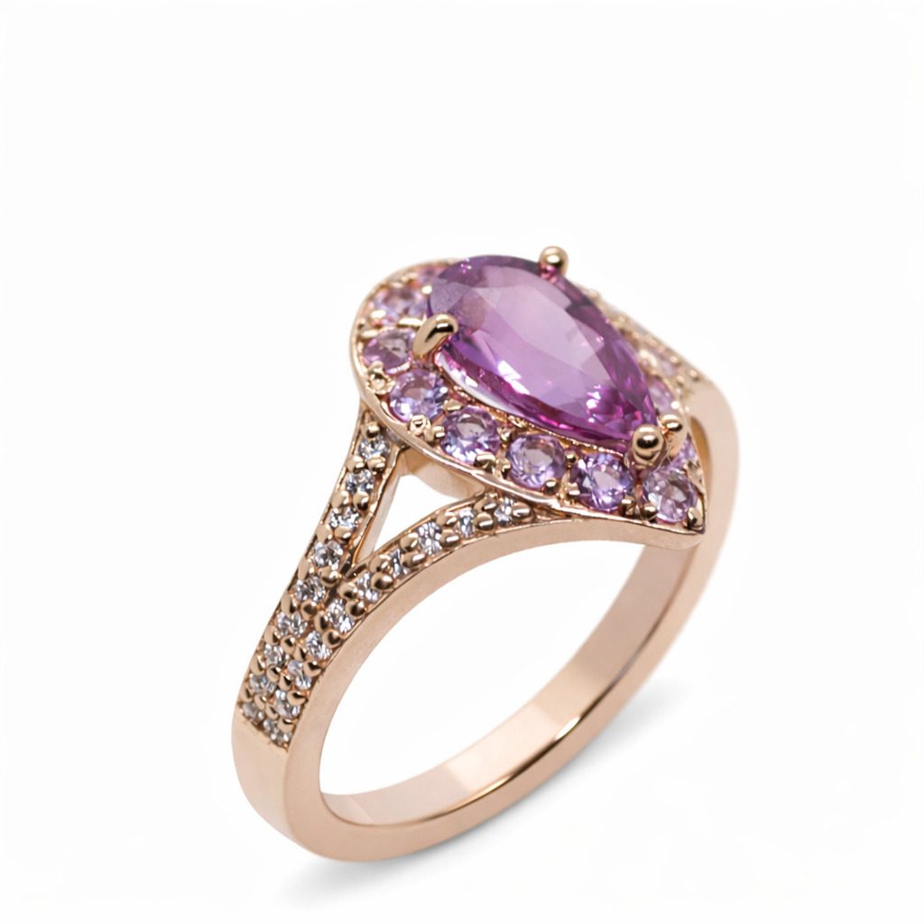 Ten zachwycający pierścionek to połączenie romantyzmu i klasy. W centrum znajduje się różowy szafir w szlifie łezki, otoczony mniejszymi kamieniami w tej samej tonacji – razem o masie 2,29 ct. Boki pierścionka zdobią subtelne diamenty o łącznej masie 0,19 ct, które dodają blasku i szlachetnego wykończenia.