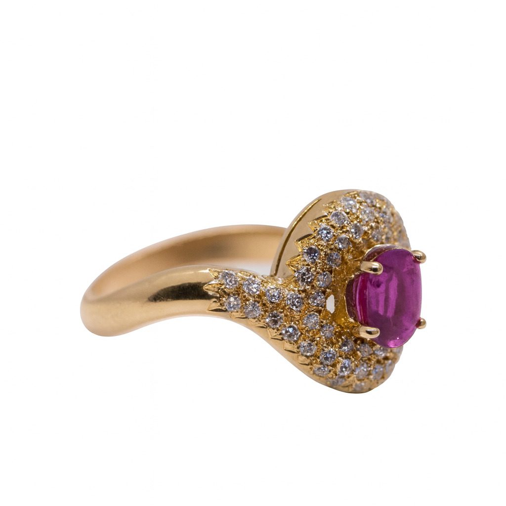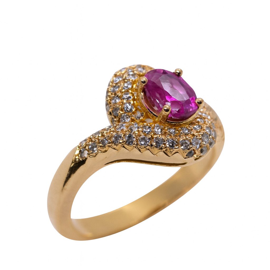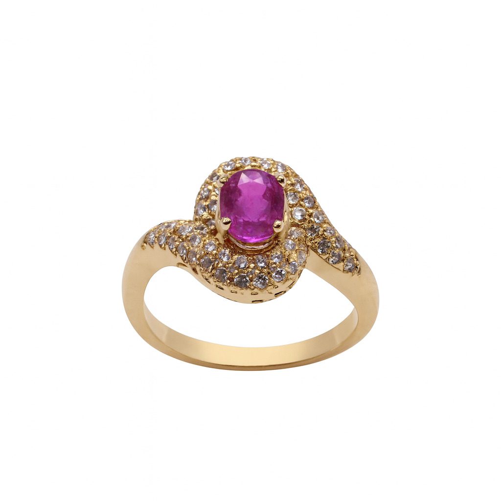 Złoty pierścionek, który zachwyca blaskiem i szlachetnym połączeniem kamieni — intensywnie różowy rubin o masie 0,91 ct stanowi centralny punkt kompozycji, otoczony połyskującymi diamentami o łącznej masie 0,30 ct.