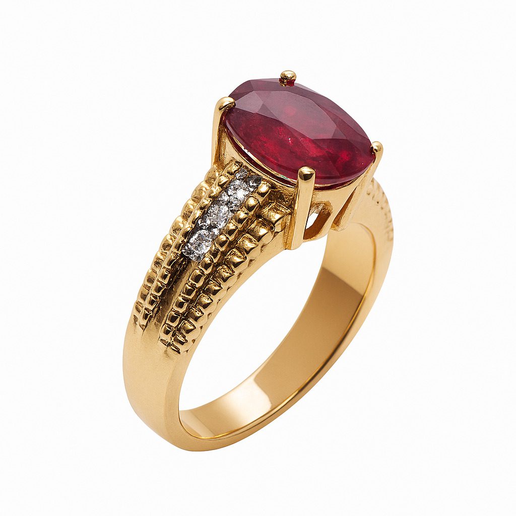 Ekskluzywny pierścionek z żółtego złota próby 750 z rubinem o masie 3,17 ct oraz diamentami o masie 0,18 ct – biżuteria pełna wyrafinowanej elegancji.