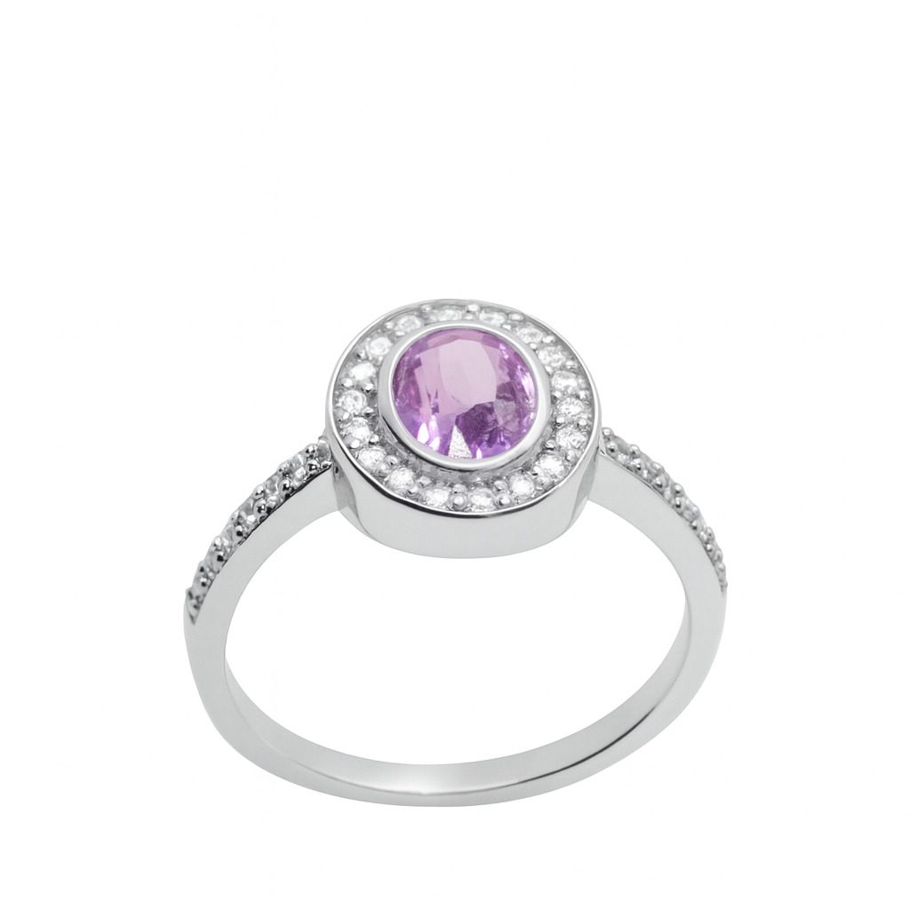 Złoty pierścionek z białego złota próby 585, ozdobiony fioletowym szafirem o masie 1,09 ct i diamentami 0,27 ct. Subtelna elegancja i klasyczny blask w nowoczesnej oprawie.