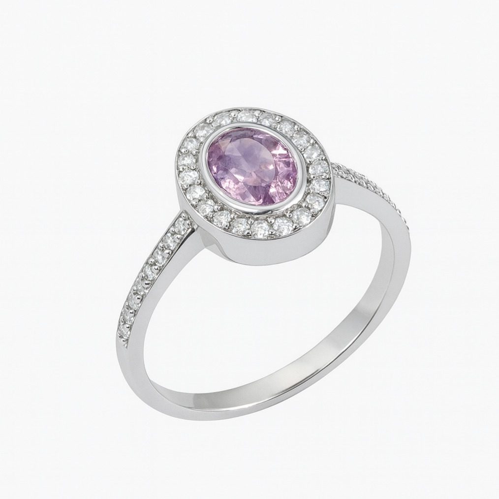 Ten wyjątkowy pierścionek to połączenie klasyki i wyrafinowanego stylu. Wykonany z białego złota próby 585, zachwyca elegancką kompozycją szlachetnych kamieni. Centralne miejsce zajmuje szafir o masie 1,09 ct w delikatnym, fioletowym odcieniu, otoczony połyskującymi diamentami o łącznej masie 0,27 ct.