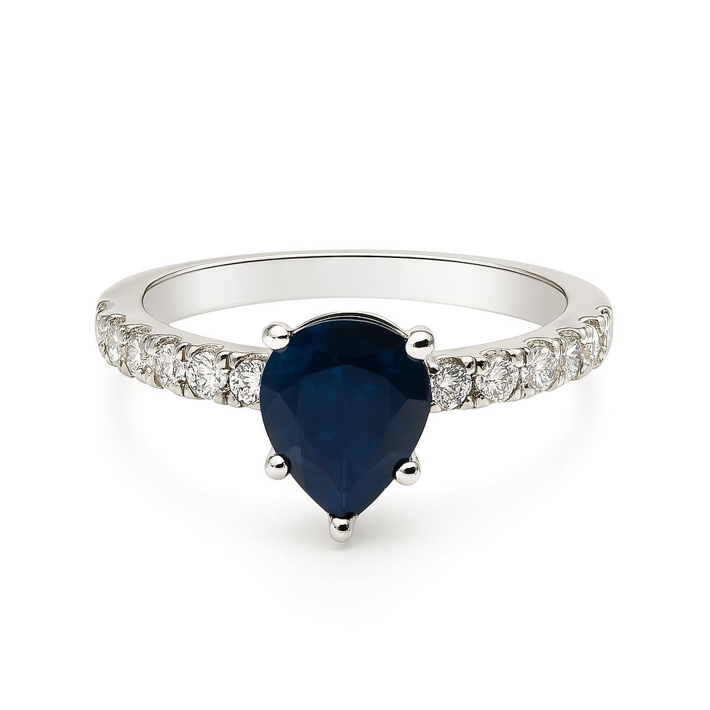 Elegancki pierścionek wykonany z białego złota próby 750 to harmonijne połączenie klasyki i nowoczesności. Centralnym punktem kompozycji jest głęboki, granatowy szafir o masie 1,24 ct, osadzony w klasycznej oprawie z czterema łapkami. Po bokach pierścionka mienią się naturalne diamenty o łącznej masie 0,30 ct, tworząc delikatny połysk, który podkreśla wyjątkowy charakter całości. Biżuteria posiada certyfikat autentyczności. Rozmiar 14. Idealna propozycja na zaręczyny lub wyjątkowy prezent. Wyrób nowy.
