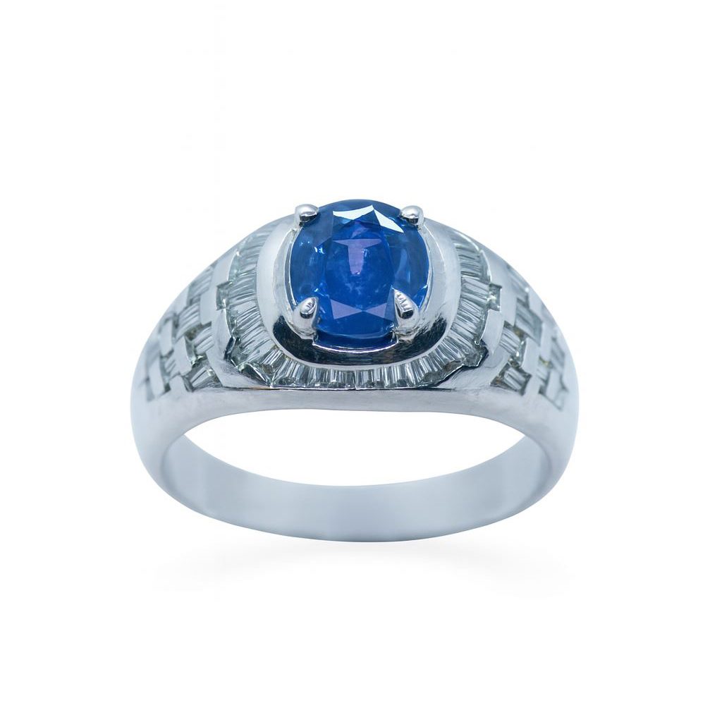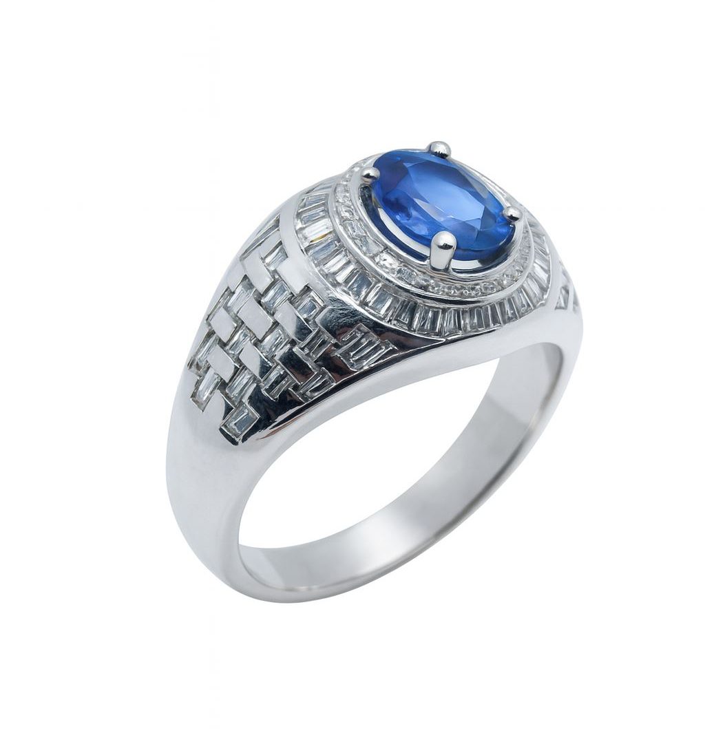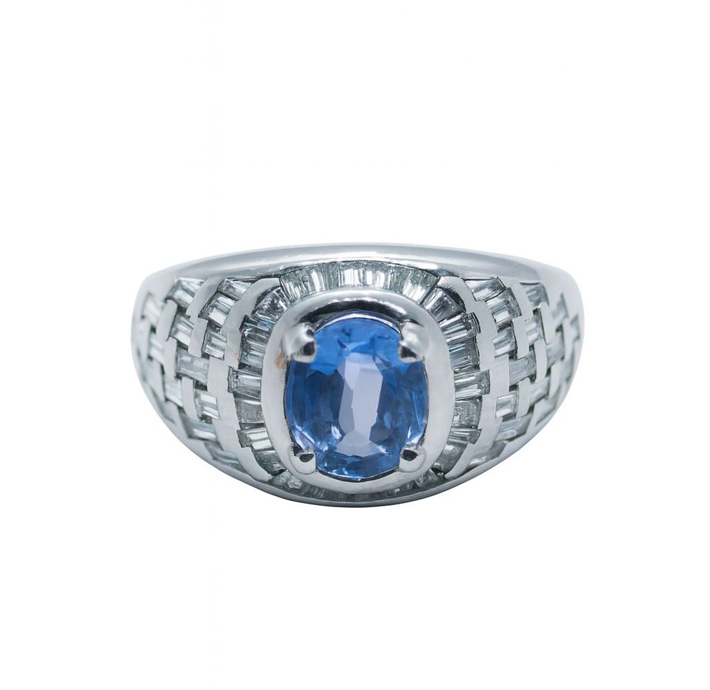 Ekskluzywny biały złoty pierścionek z szafirem 1.52 ct oraz diamentami o łącznej masie 1.20 ct. Wykonany z białego złota próby 750. Rozmiar 19. Produkt używany, z certyfikatem autentyczności.