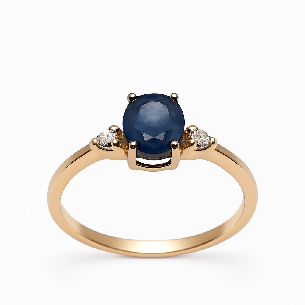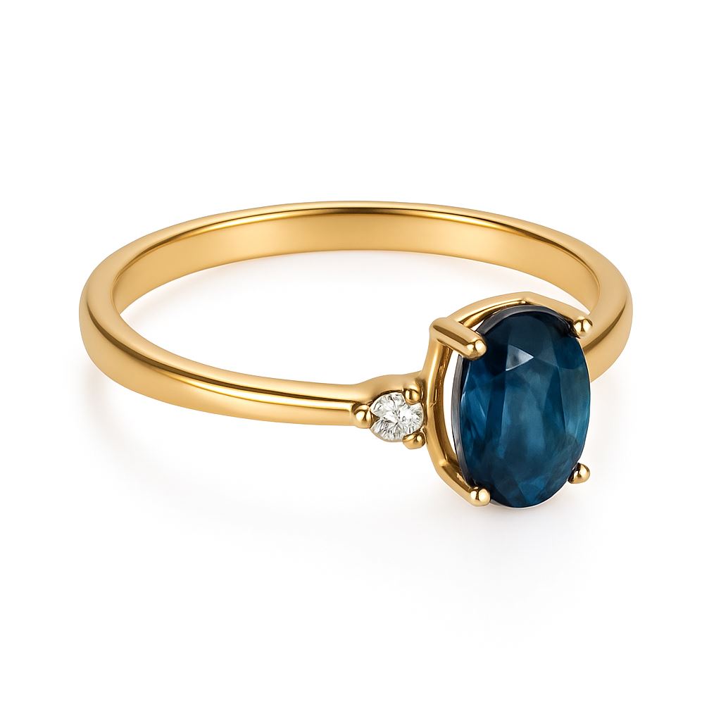 Ten elegancki pierścionek został wykonany z żółtego złota próby 585 i wyróżnia się minimalistycznym, ponadczasowym stylem. Centralnym punktem biżuterii jest piękny, owalny szafir o masie 1 ct w intensywnie granatowym kolorze, który podkreśla jego szlachetność i wyrazistość. Dodatkowy akcent w postaci subtelnego diamentu o masie 0.05 ct nadaje całości luksusowego charakteru. Idealny wybór dla kobiet ceniących klasykę z nutą elegancji. Pierścionek jest używany, zachowany w bardzo dobrym stanie, sprzedawany z certyfikatem. Rozmiar 9.