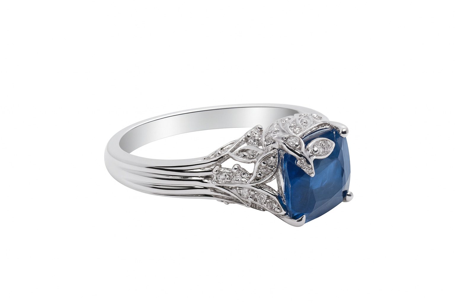 Szafir otoczony został misternie oprawionymi diamentami o łącznej masie 0,39 ct, które podkreślają głębię niebieskiego kamienia i dodają całości blasku. Ażurowa, delikatna oprawa z subtelnymi motywami roślinnymi sprawia, że pierścionek prezentuje się niezwykle lekko i zjawiskowo mimo solidnej wagi 5,78 g.