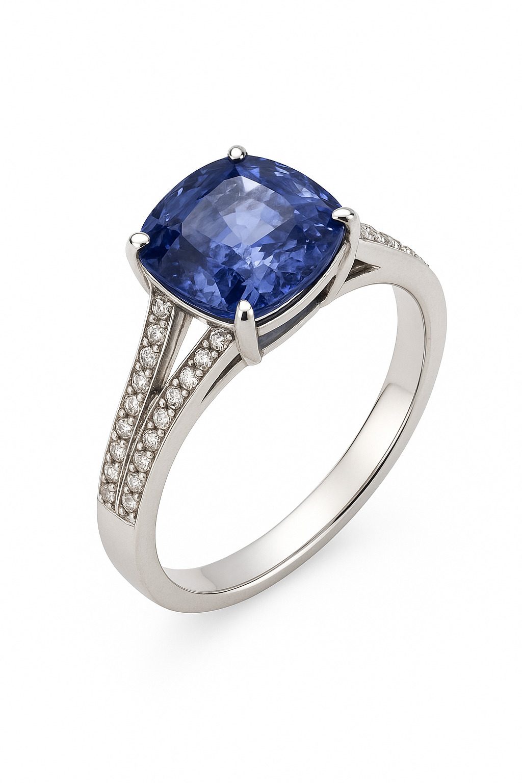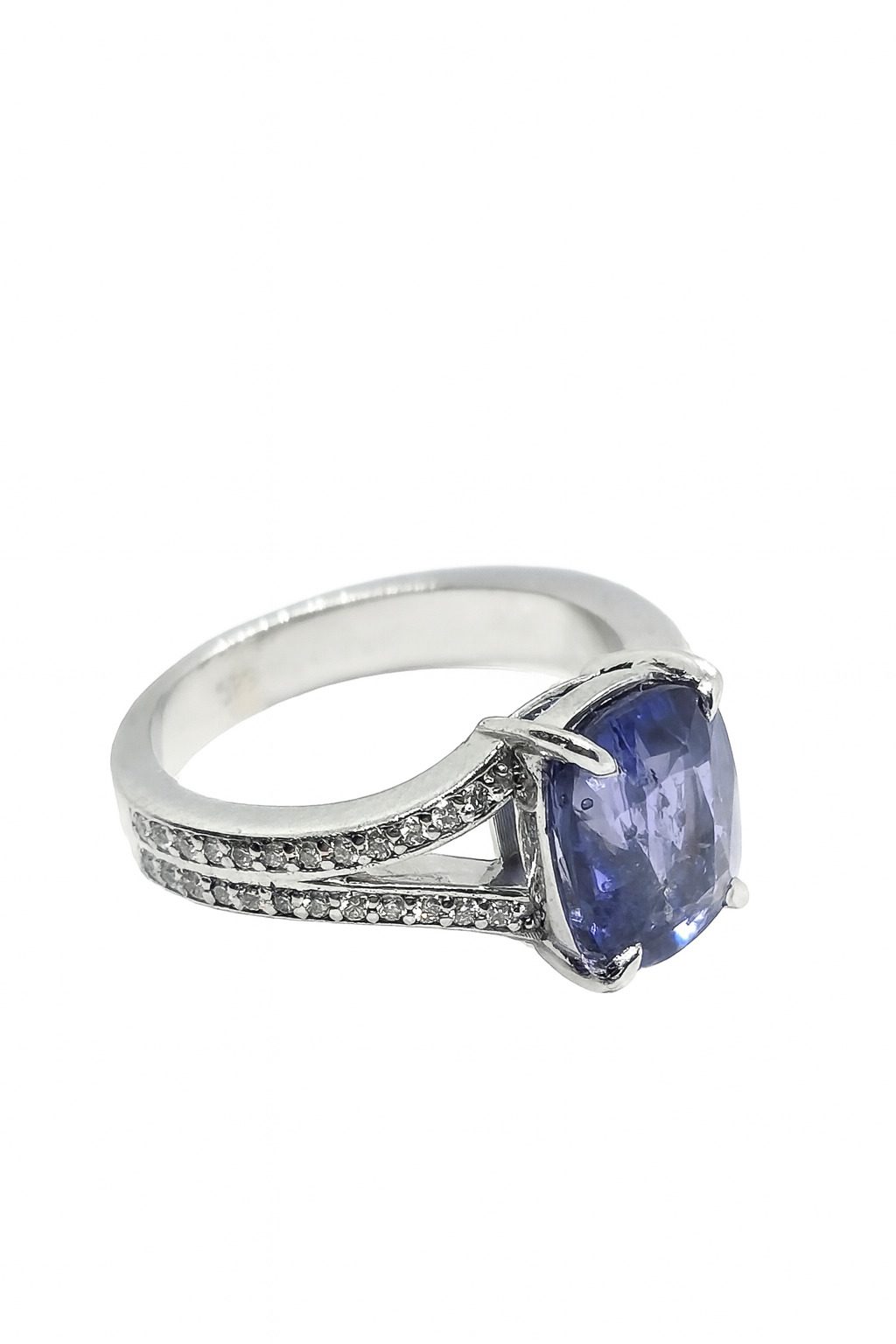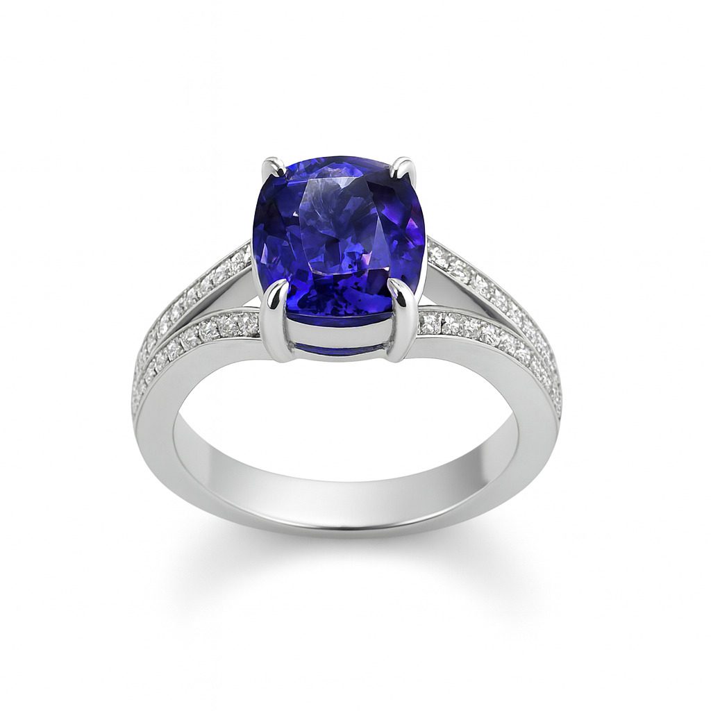 Ten wyjątkowy pierścionek wykonany z białego złota próby 585 to esencja elegancji i szlachetnego stylu. Centralny element stanowi imponujący szafir o masie 4.14 ct – kamień o głębokiej, nasyconej barwie, który emanuje luksusem i siłą.
