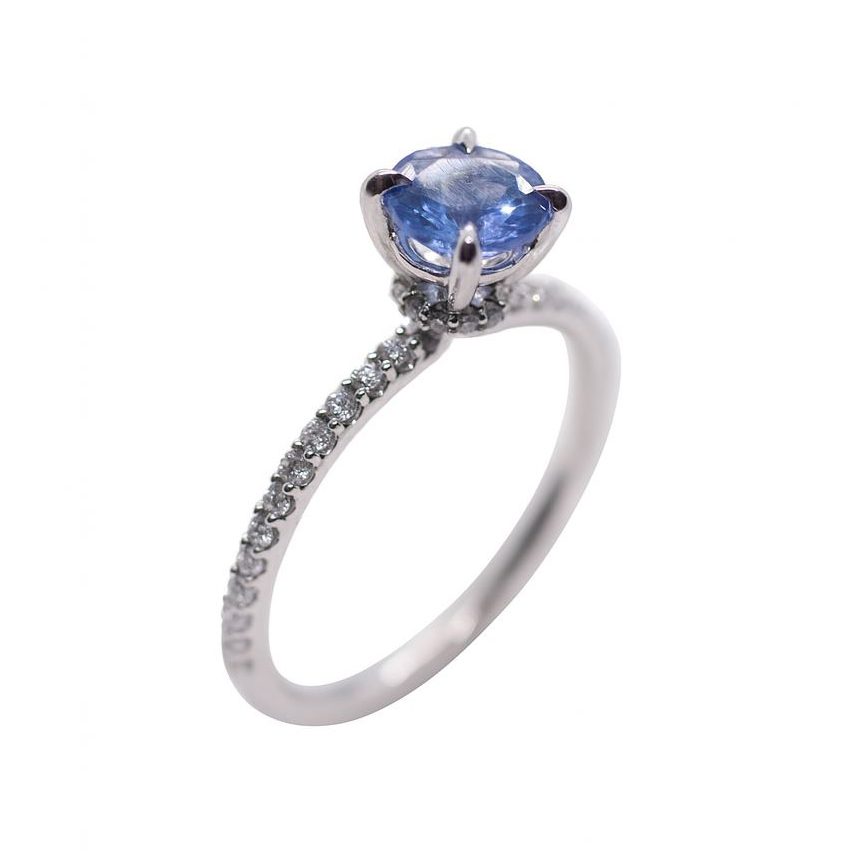 Zachwycający złoty pierścionek z białego złota próby 585, ozdobiony tanzanitem 0,81 ct oraz diamentami o łącznej masie 0,25 ct. Rozmiar 15. Nowy, z certyfikatem.