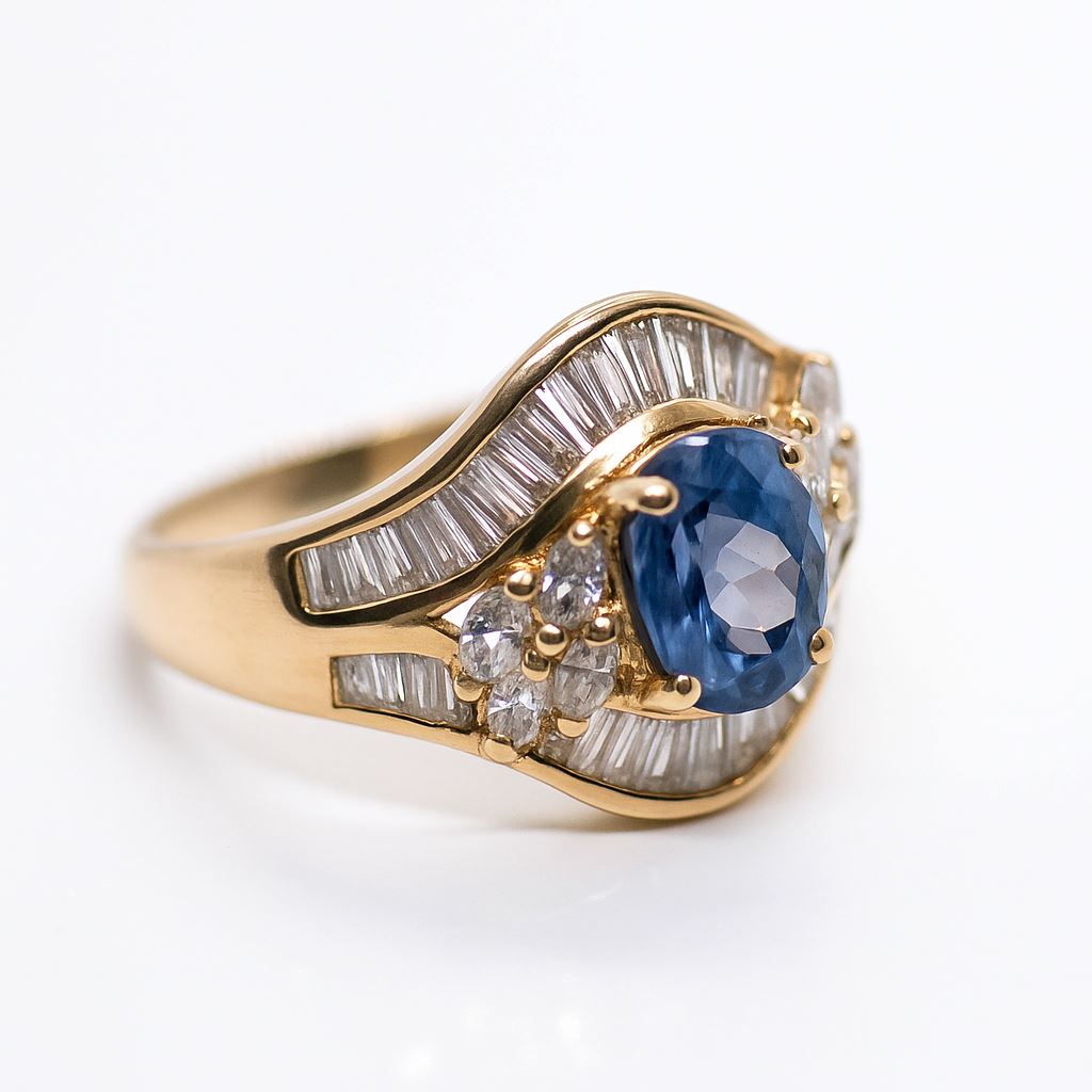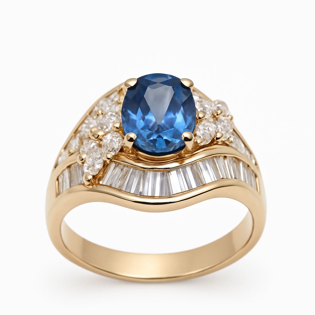 Ten wyjątkowy pierścionek został wykonany z żółtego złota próby 585 i wyróżnia się niepowtarzalnym, luksusowym wzornictwem. Centralnym punktem jest intensywnie niebieski tanzanit o masie 1.72 ct, który otaczają liczne diamenty o łącznej masie 1.17 ct, w różnych szlifach — zarówno baguette, jak i brylantowych. Kompozycja prezentuje się niezwykle elegancko i przyciąga wzrok swoją wyjątkową formą oraz bogactwem zdobień. Idealny wybór dla osób poszukujących biżuterii z charakterem. Używany, w bardzo dobrym stanie, sprzedawany z certyfikatem autentyczności. Rozmiar 17.