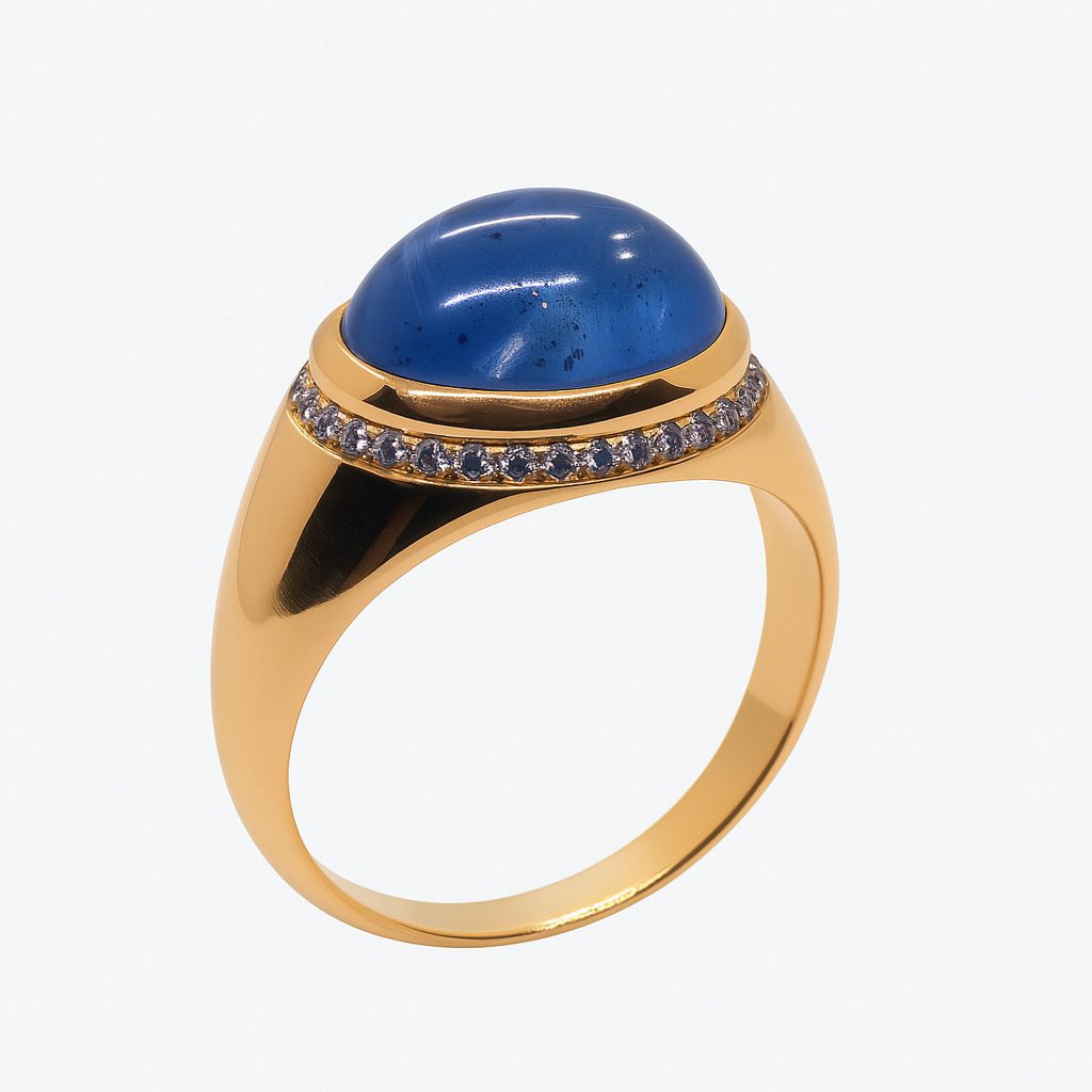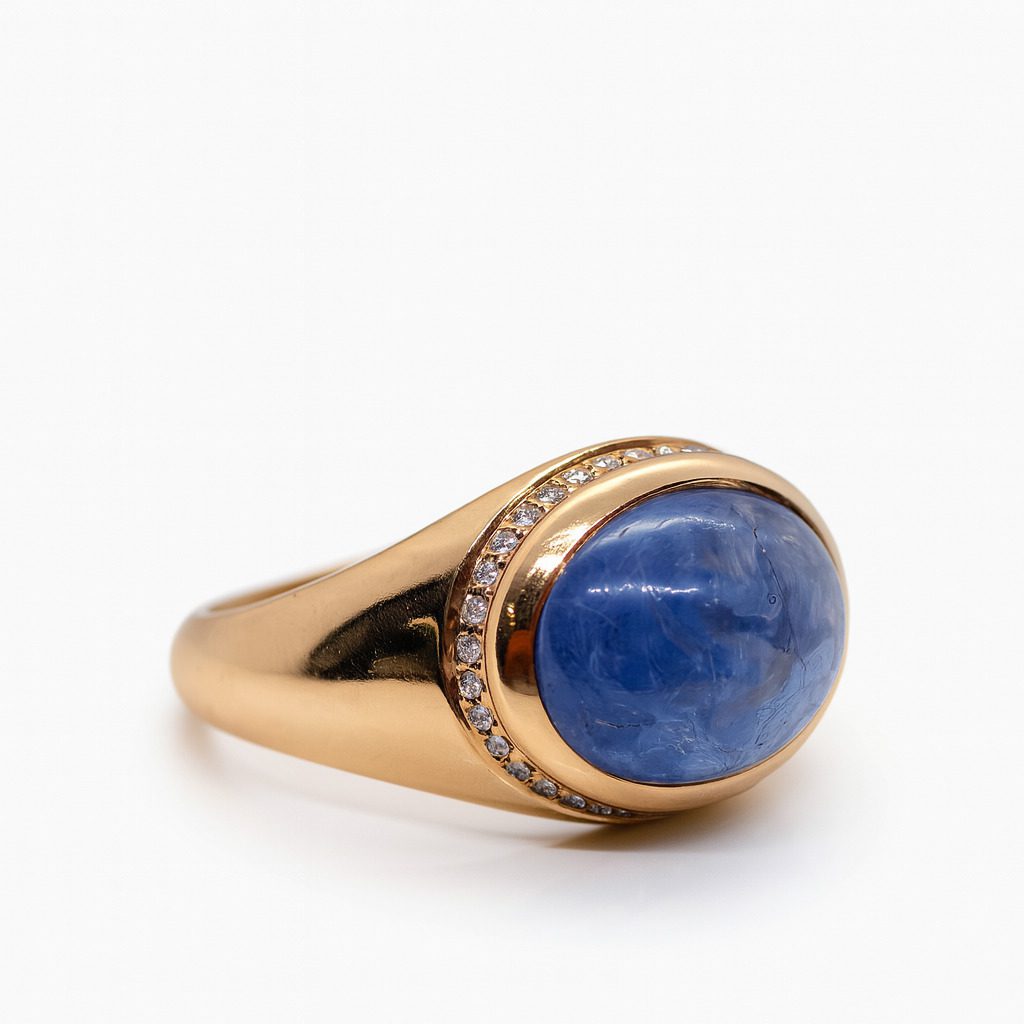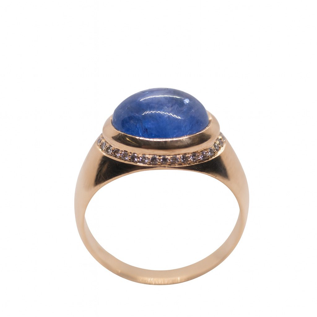 Luksusowy, używany pierścionek wykonany z wysokiej próby żółtego złota (750), ozdobiony spektakularnym, kaboszonowym tanzanitem o masie 4,25 ct. Kamień otacza elegancki rząd naturalnych diamentów o łącznej masie 0,15 ct, które dodają kompozycji blasku i prestiżu. Całość tworzy harmonijną i wyrafinowaną formę, idealną dla miłośniczek wyjątkowej, szlachetnej biżuterii. Pierścionek waży 5,49 g, posiada certyfikat i dostępny jest w rozmiarze 15.