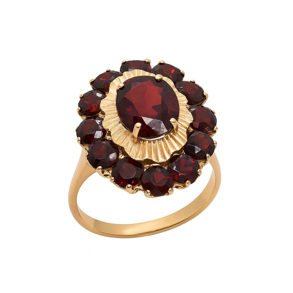 Złoty pierścionek z granatami, wykonany z żółtego złota próby 750. Elegancka, okazała forma o bogatym kolorze i klasycznym uroku.