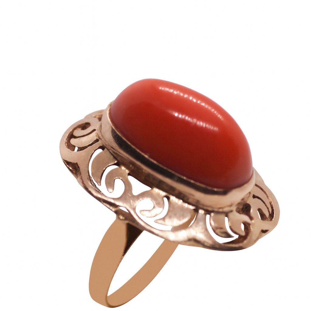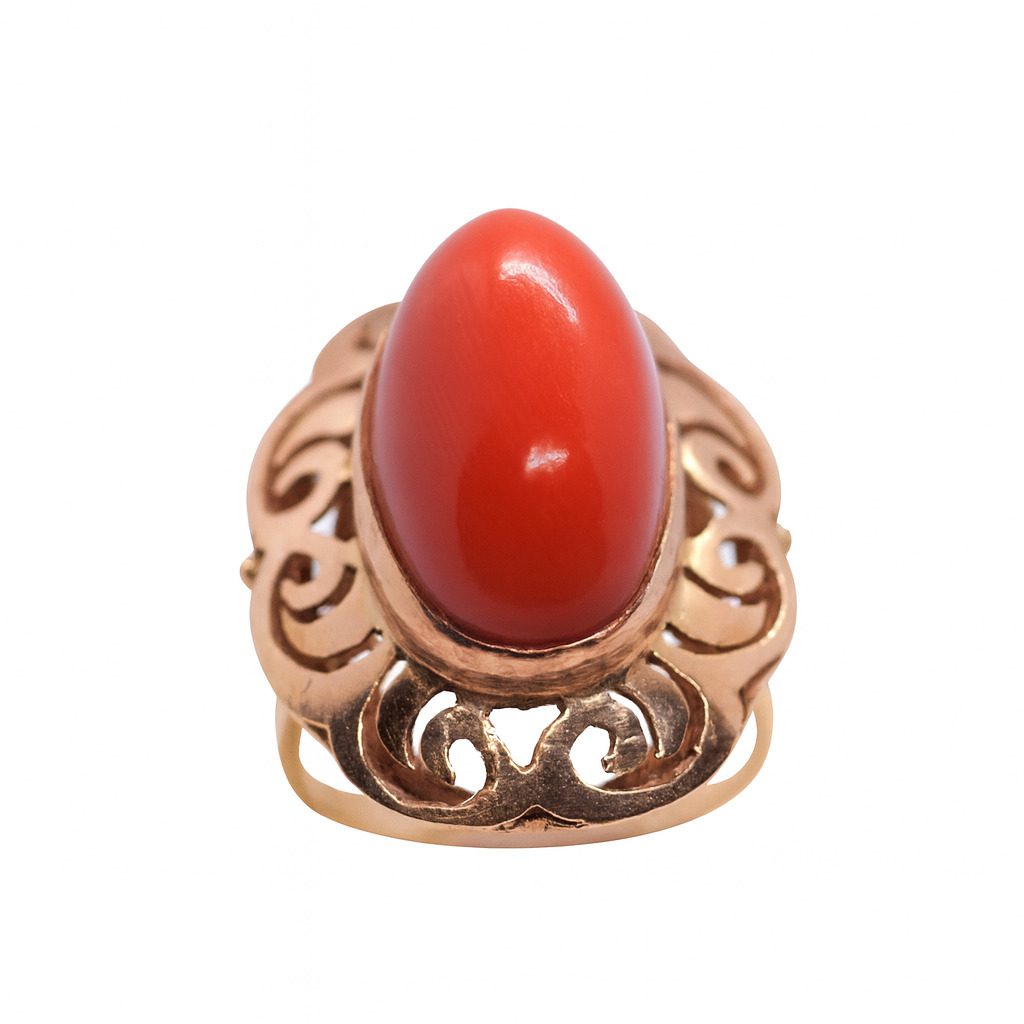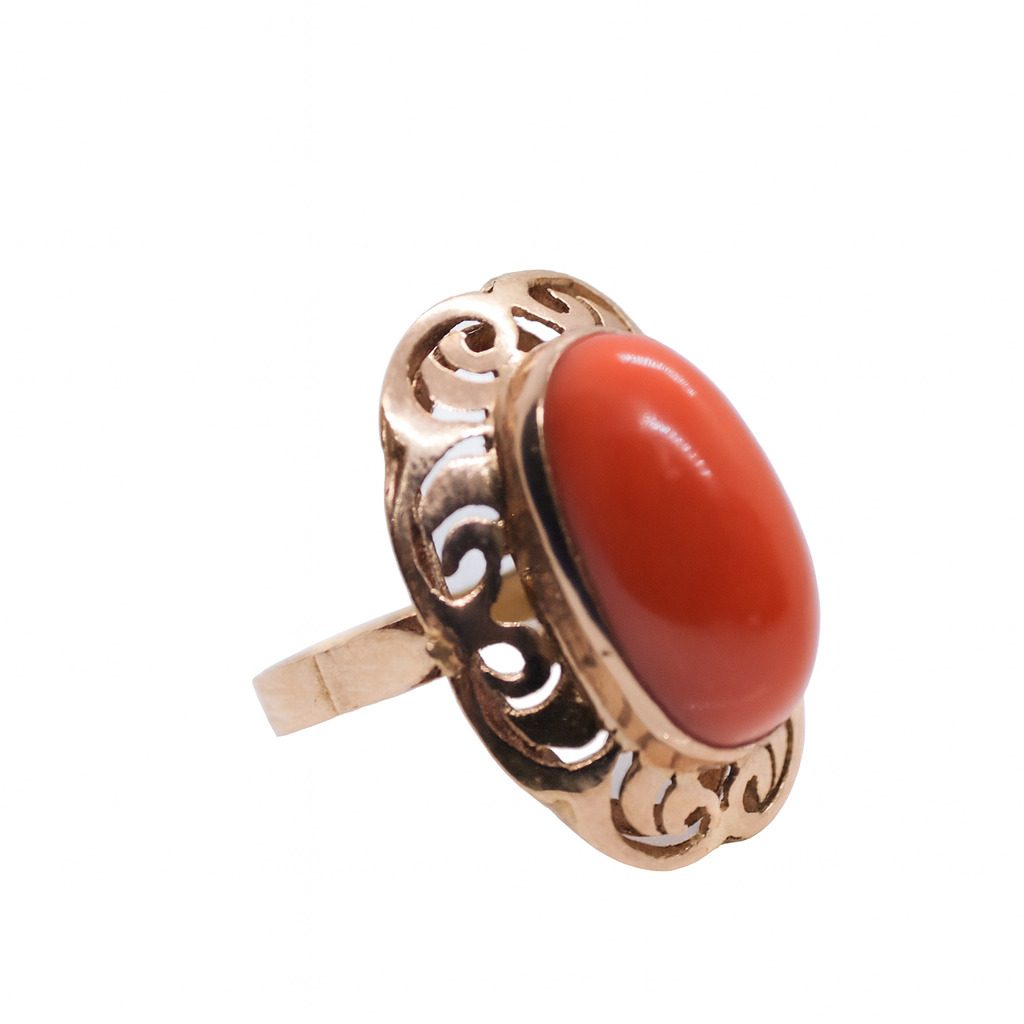Złoty pierścionek z różowego złota próby 750, ozdobiony naturalnym koralem w intensywnym czerwonym odcieniu. Elegancki, klasyczny wzór z ażurowymi zdobieniami.