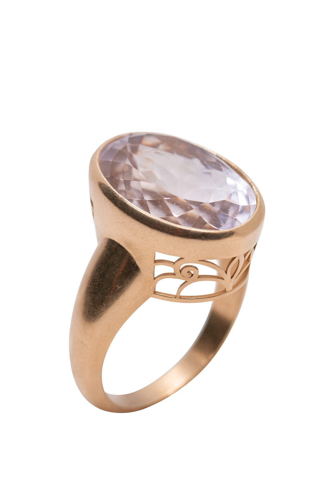 Ten elegancki pierścionek wykonany z żółtego złota próby 585 zachwyca delikatnym kolorem i niepowtarzalnym blaskiem kunzytu. Duży kamień o masie 12,58 ct został osadzony w masywnej, a zarazem kobiecej oprawie z finezyjnym, ażurowym wzorem po bokach.
