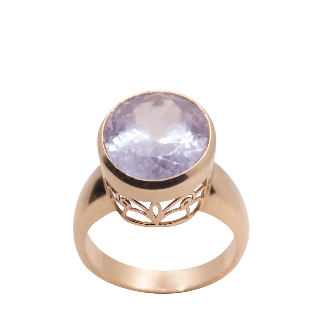 Złoty pierścionek z żółtego złota próby 585, ozdobiony okazałym kunzytem o masie 12,58 ct. Wyjątkowa biżuteria o subtelnym, romantycznym charakterze.